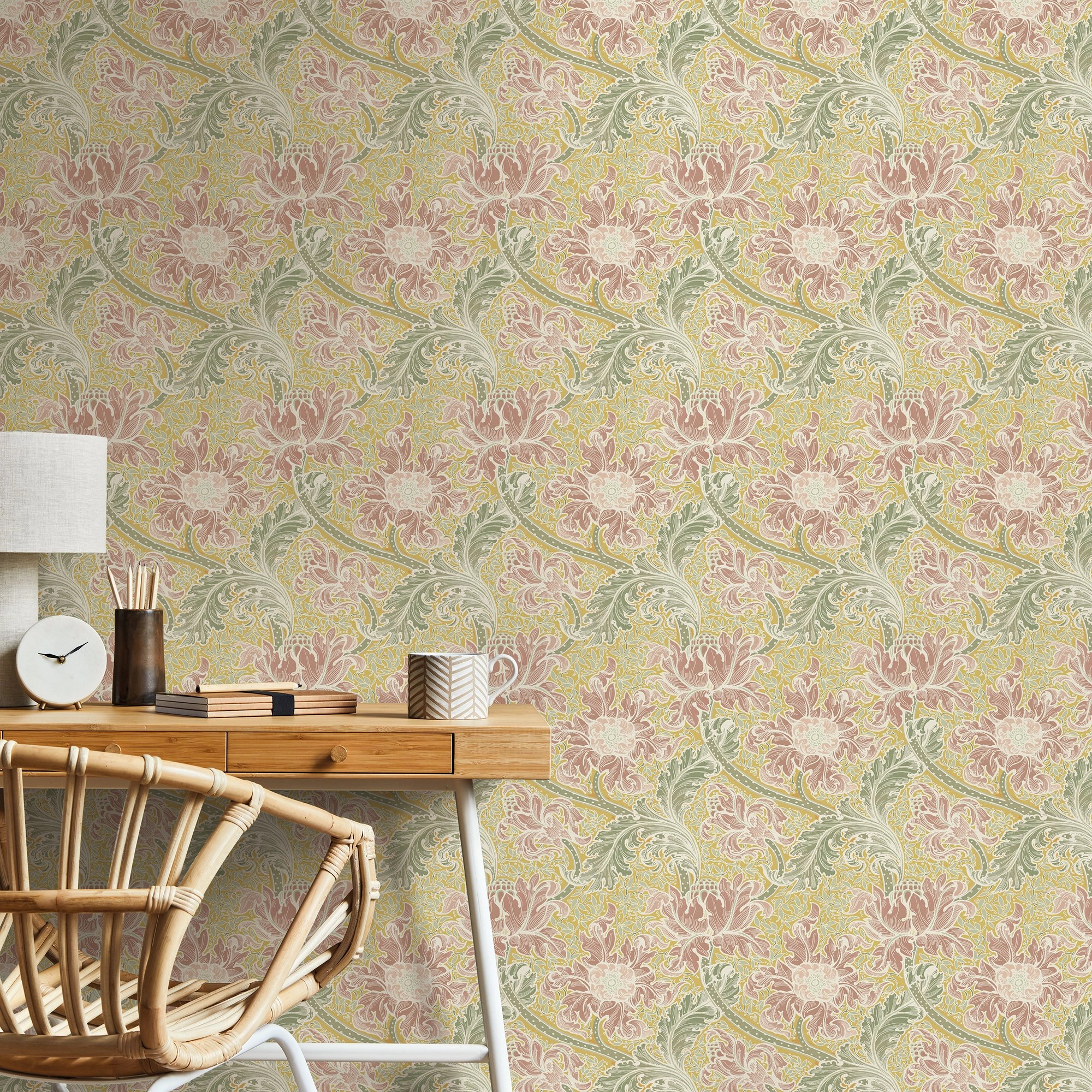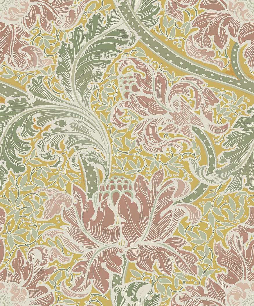 Angol dekor tapéta szecessziós akantuszvirág mintával sárga, piros és zöld színekben