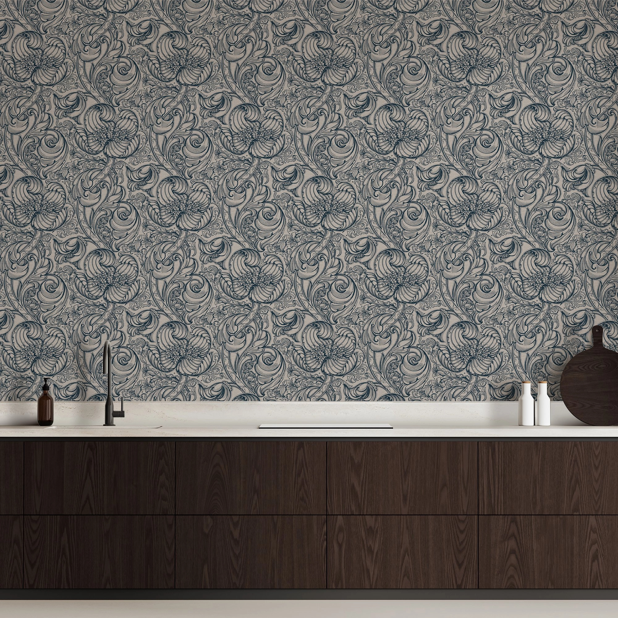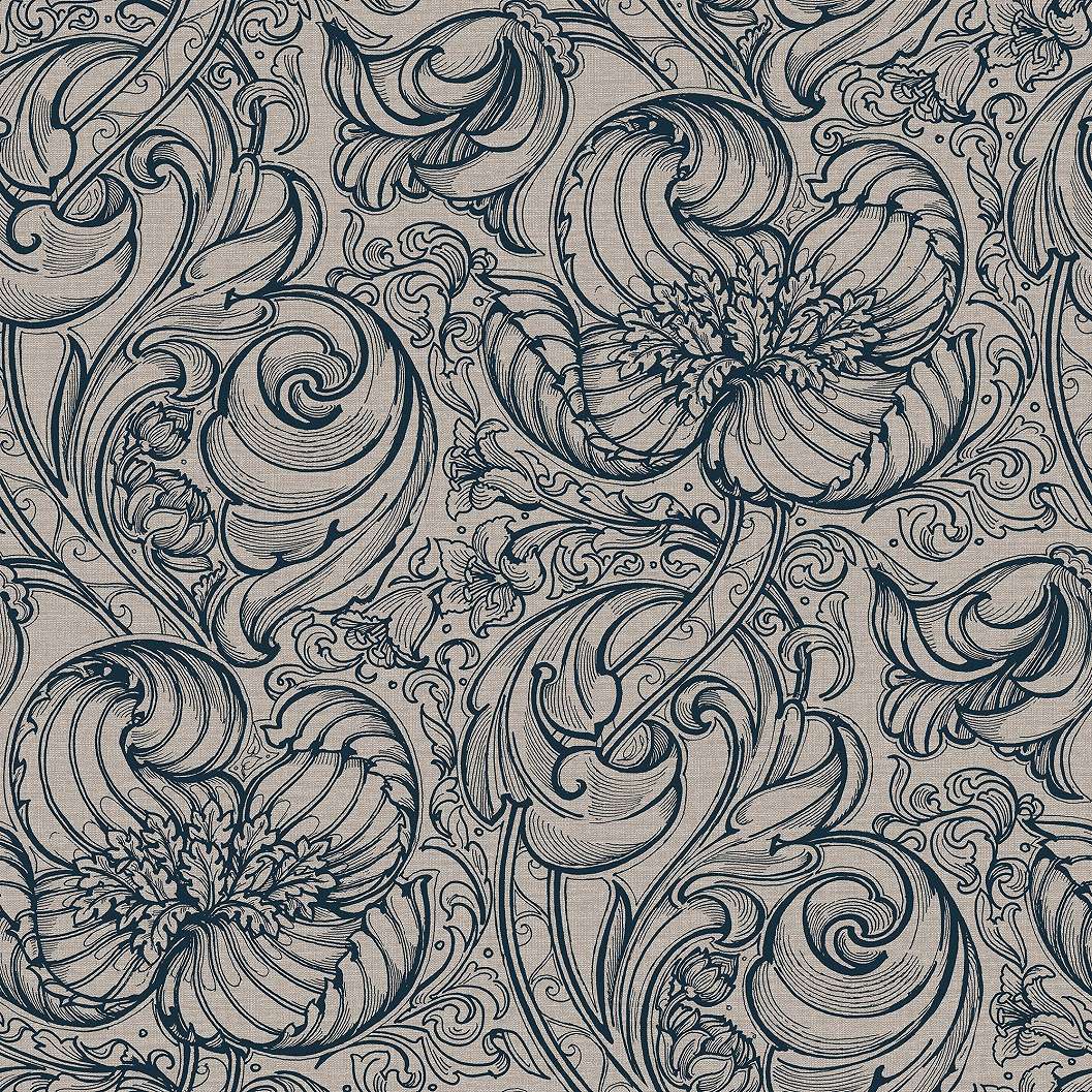 Angol dekor tapéta szecessziós pünkösdirózsa mintával lenbarna és matrózkék színben