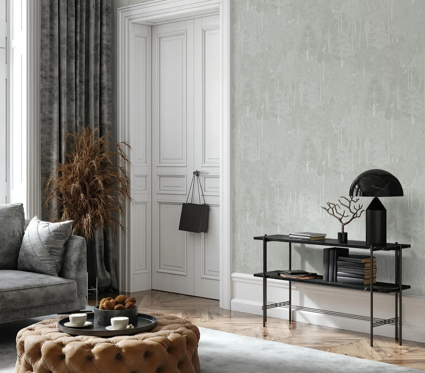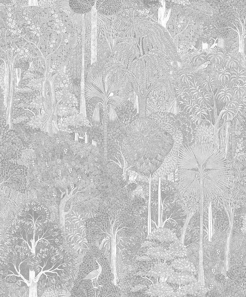 Angol stílusú dekor tapéta trópusi erdő mintával szürke színben