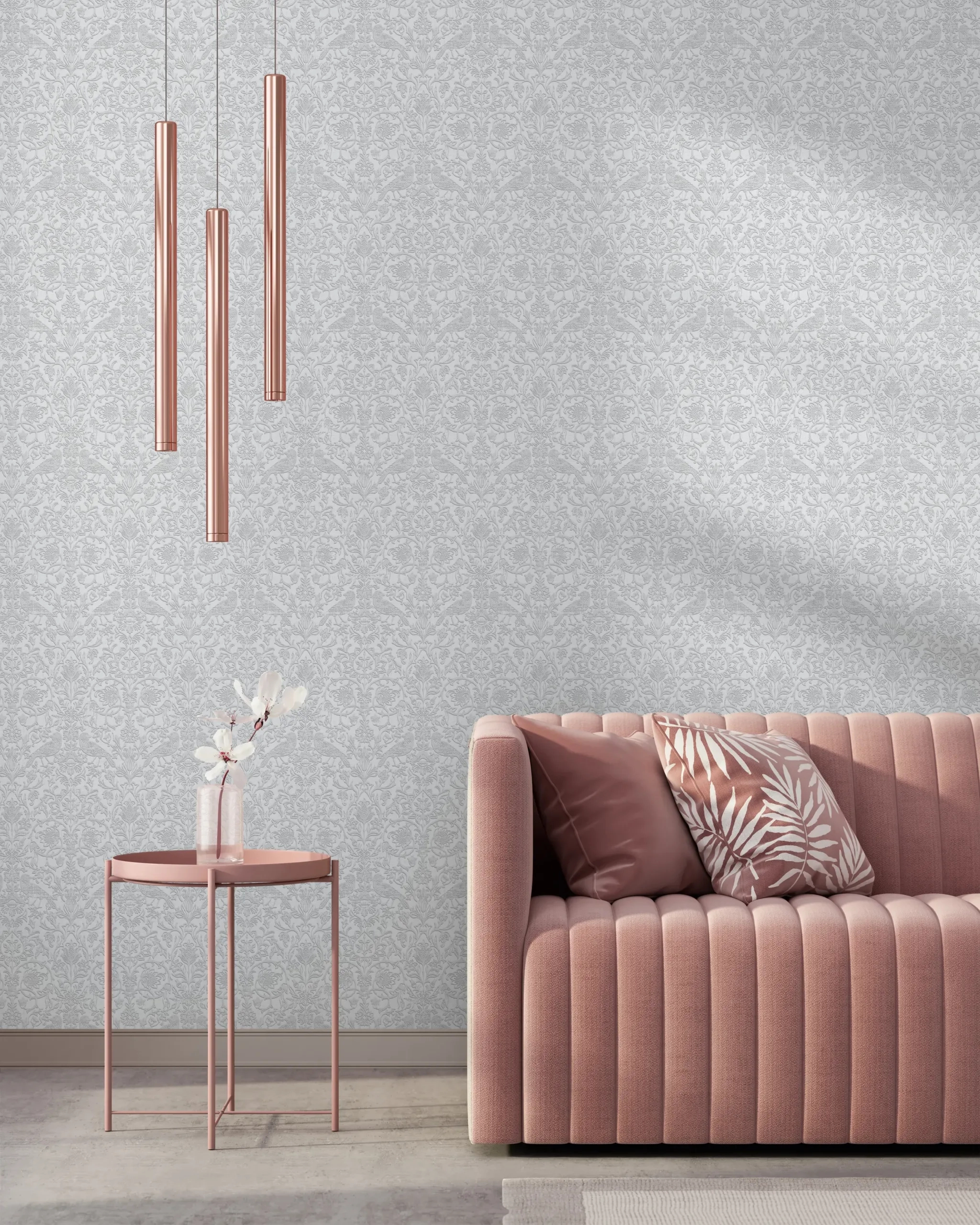 Angol stílusú dekor tapéta virágos inda és madár sziluett mintával szürke színben