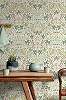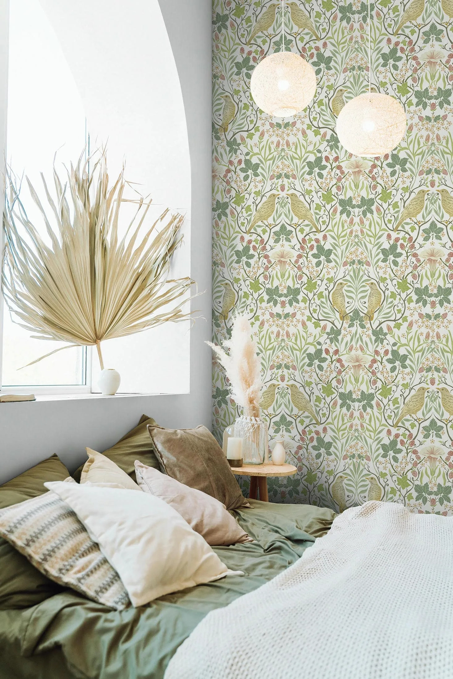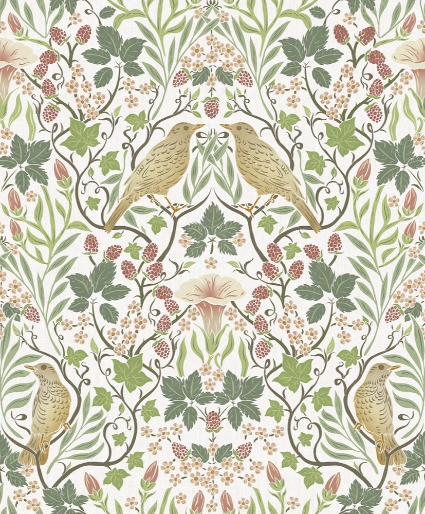 Angol stílusú dekor tapéta virágos inda madár mintával pasztel színben fehér háttéren
