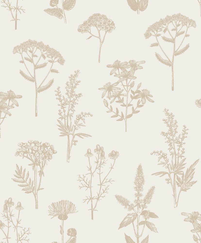 Nem kevésbé légies a következő modell sem: itt a finom grafikát botanikus minták rajzolatai alkotják, a törtfehér és az arany kombinációja pedig igazán könnyed, légies összhatást kelt. Gyékény, rattan, mezei virágok és a nyári naplemente beszűrődő fénye a szobába - és az arany tapéta máris szinte önálló életre kel a falakon!