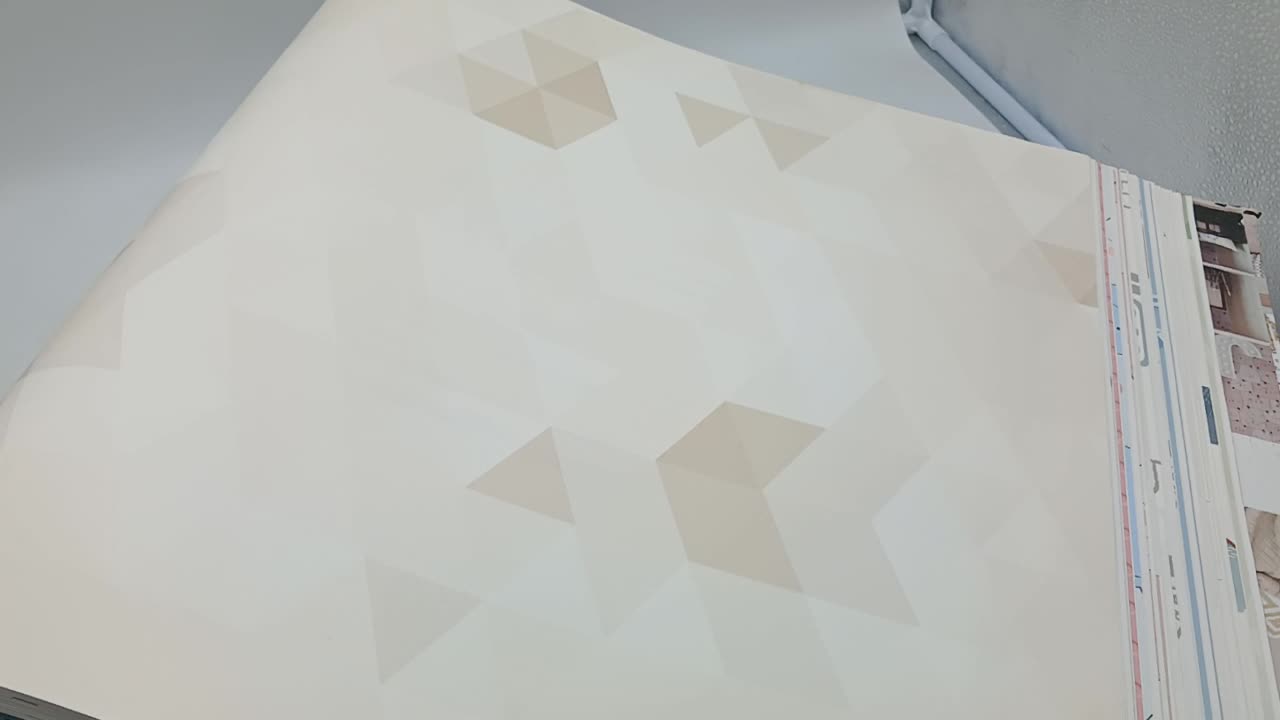 A szobafotón a geometrikus gyerektapéta egy másik színe látható.