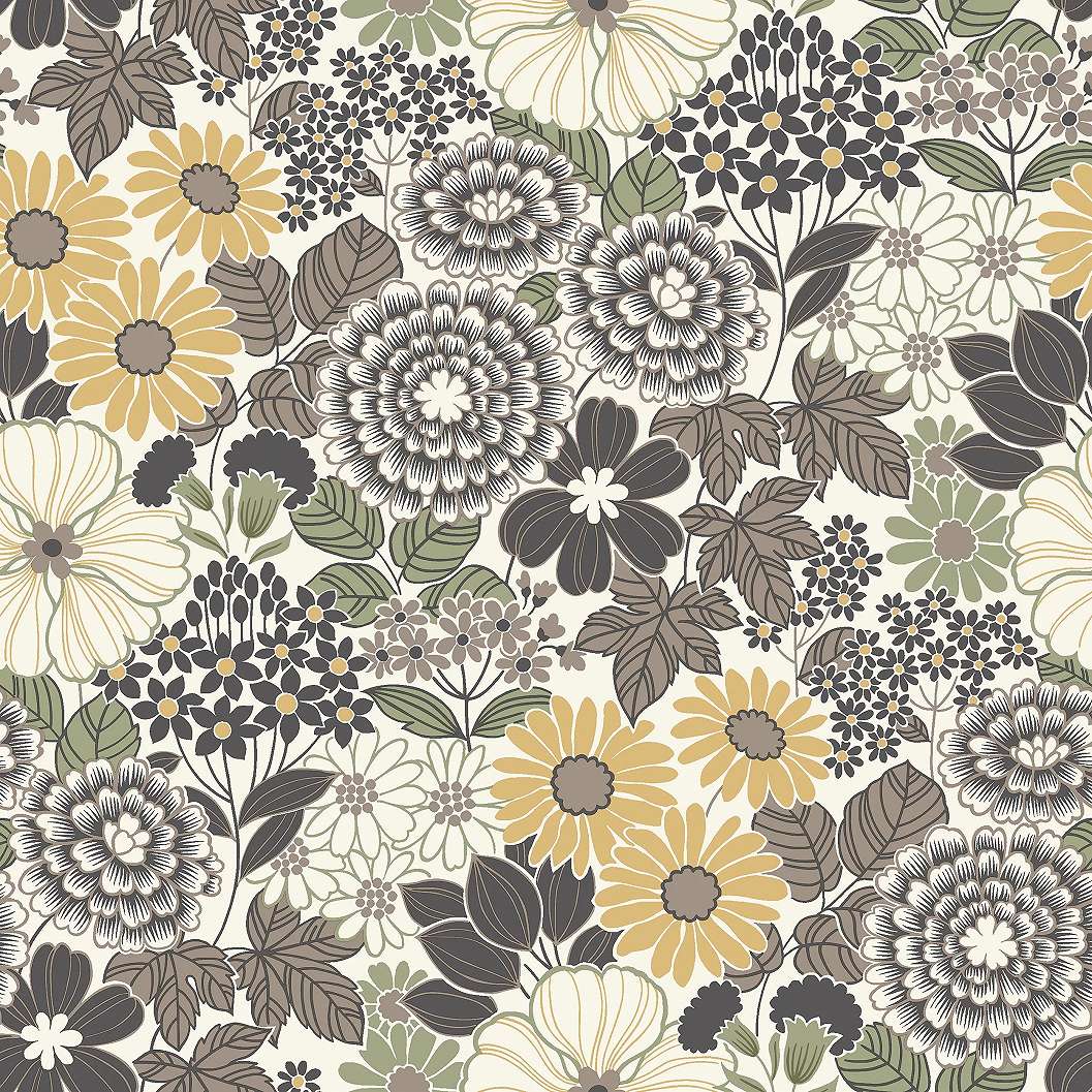Boras tapéta nagy virágoskert mintával sárga és barna színben