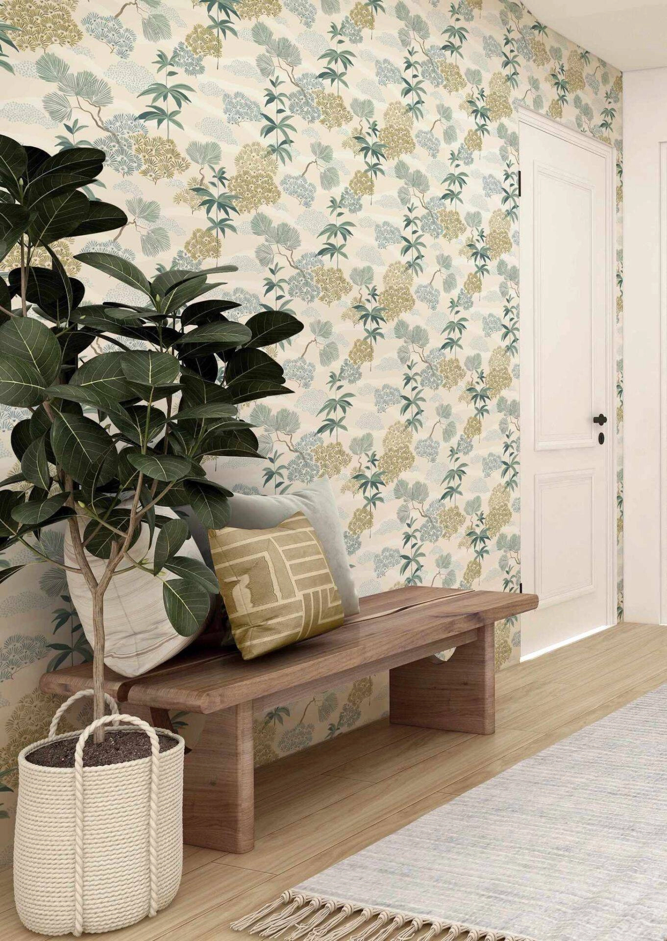 Botanikus mintás dekor tapéta kék zöld színekkel