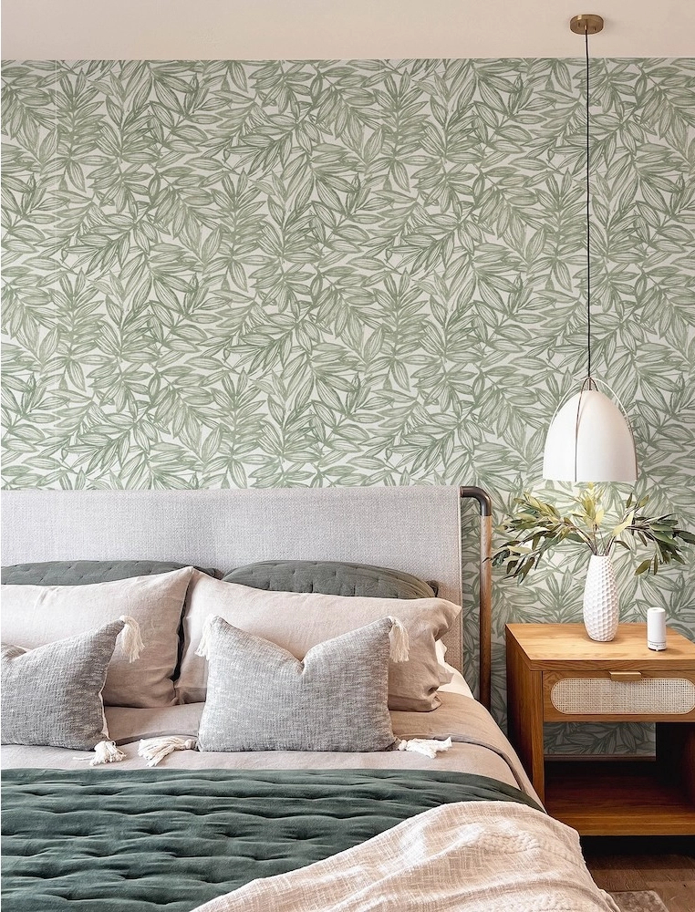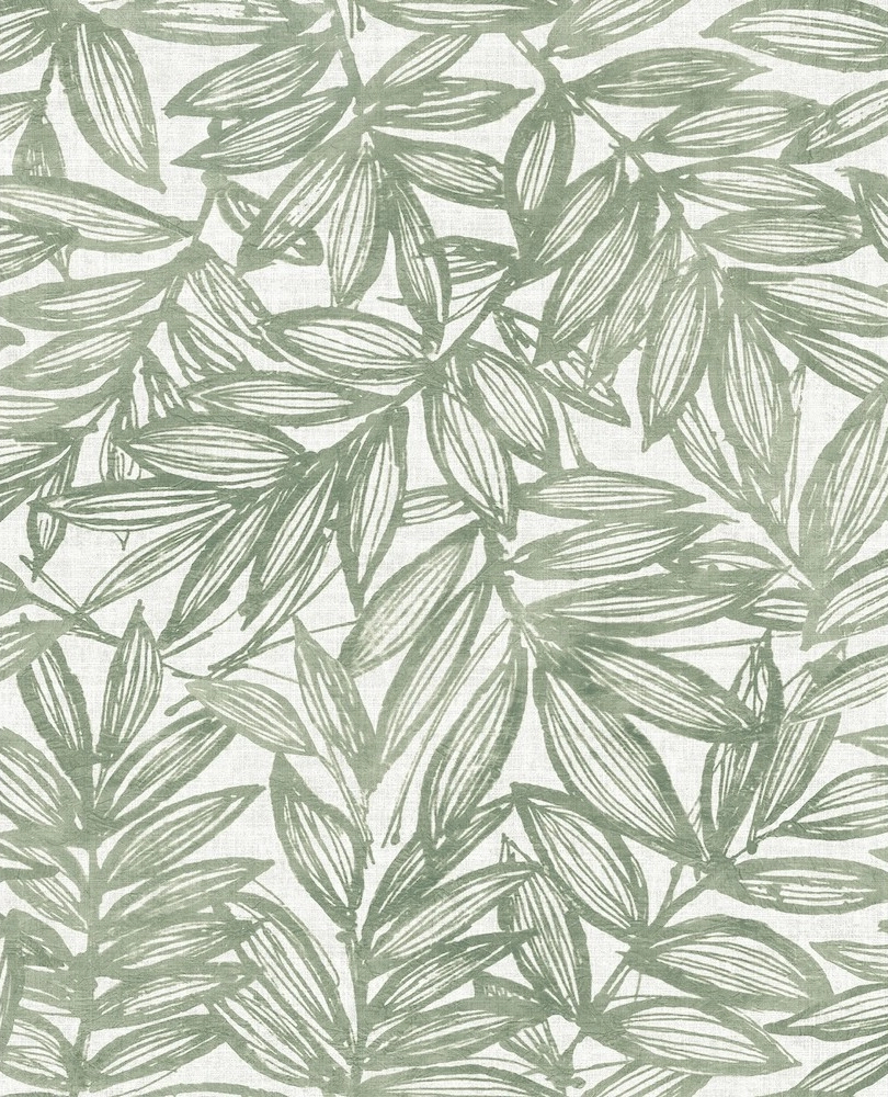 Dekor tapéta levél mintával fehér és zsályazöld színben, vintage stílushoz