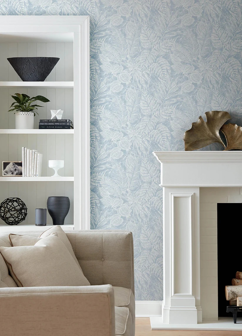 Dekor tapéta trópusi levél mintával égkék színben