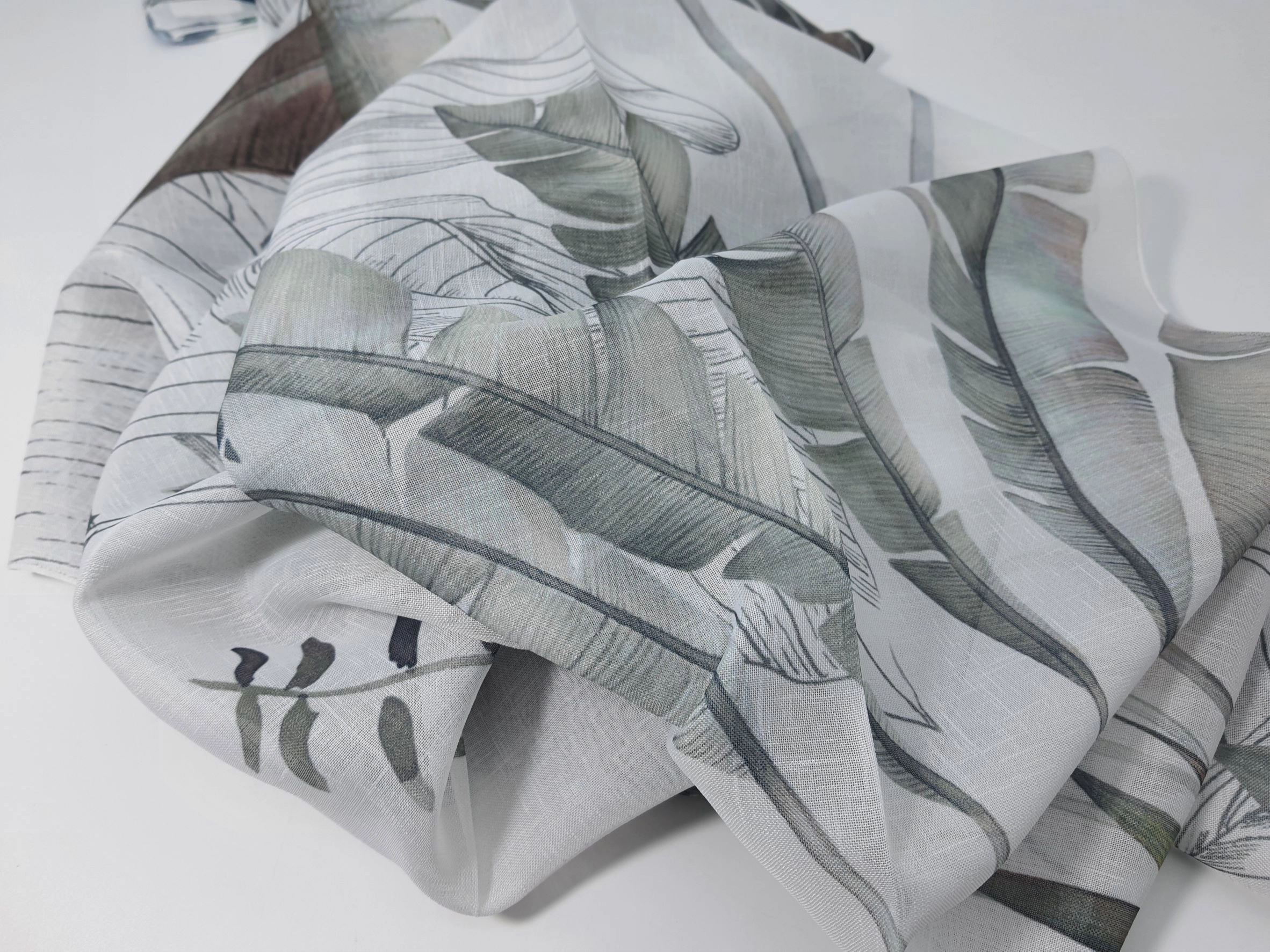 Design fényáteresztő függöny textil zöldes színvilágban banánlevél mintával