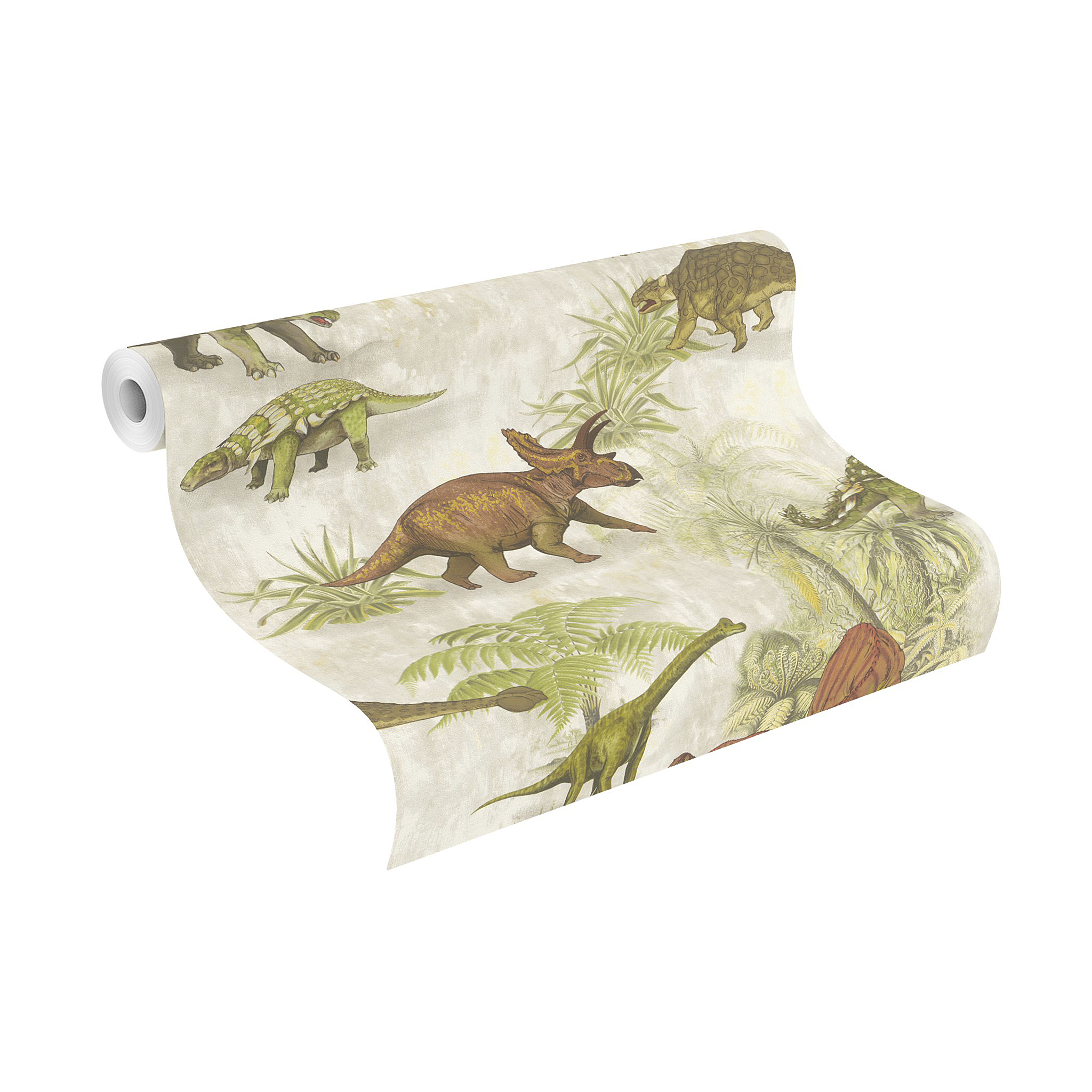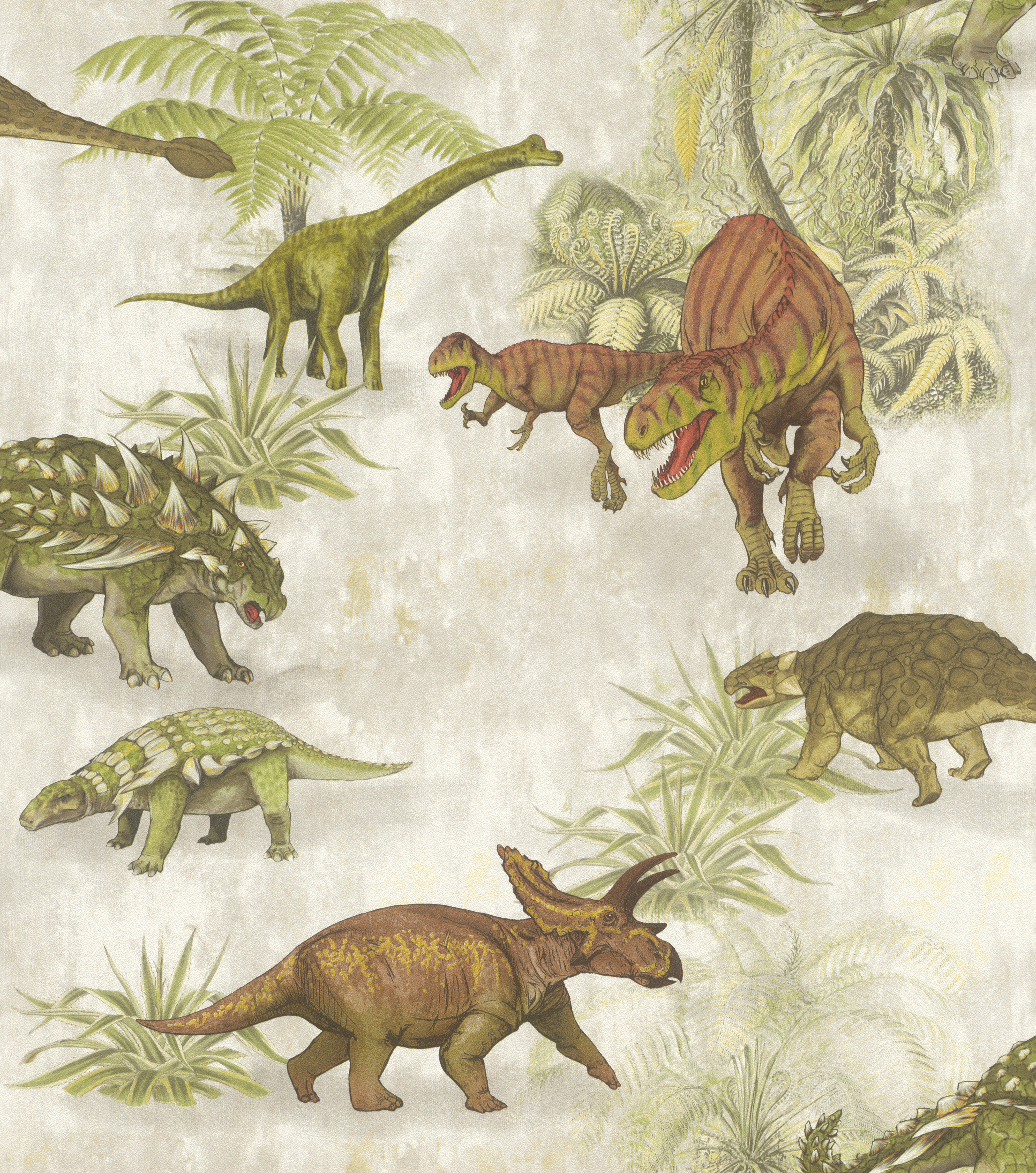 Dinószaurusz gyerek tapéta, zöldes, barnás dinó mintákkal
