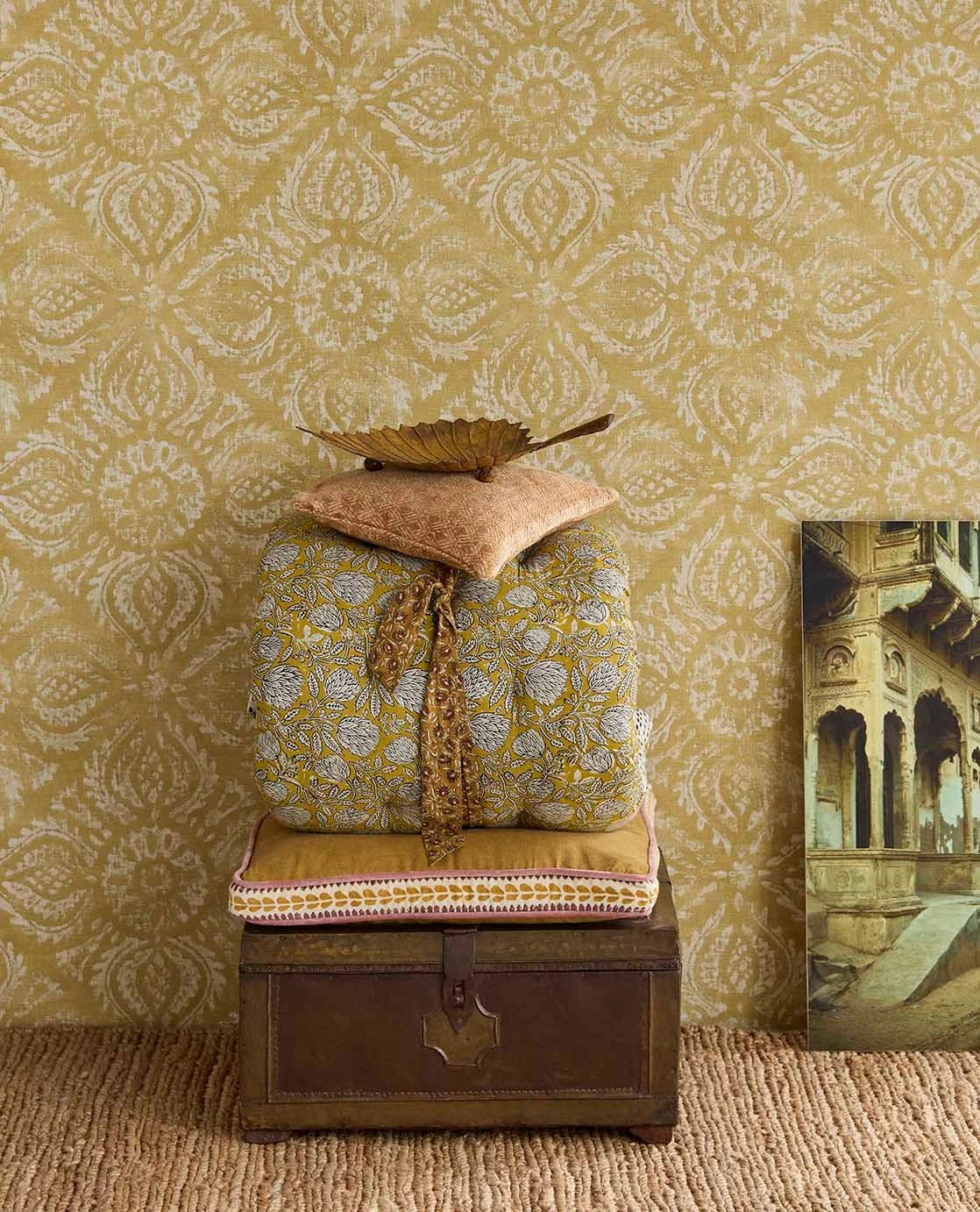 Eijffinger koptatott virág mintás textilhatású indiánsárga és homok színű vinyl design tapéta
