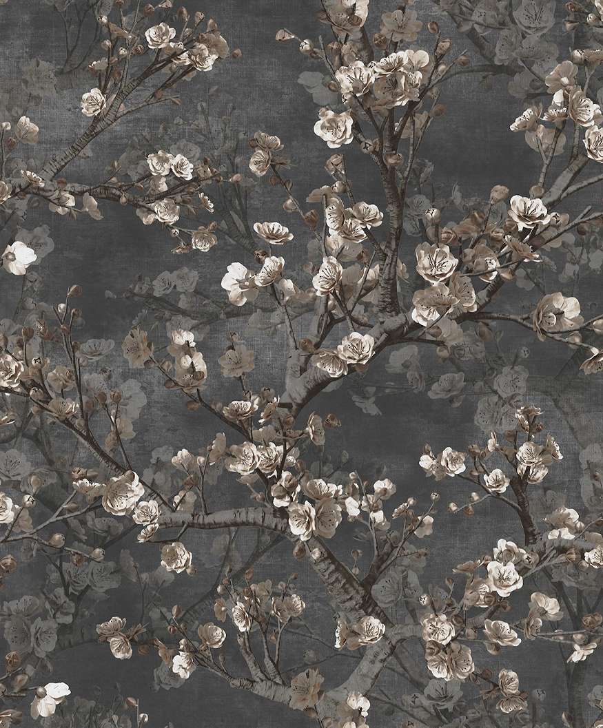 Elegáns dekor tapéta koptatott virágzó cseresznyefa mintával drapp és grafitszürke színben, természeti és modern stílushoz