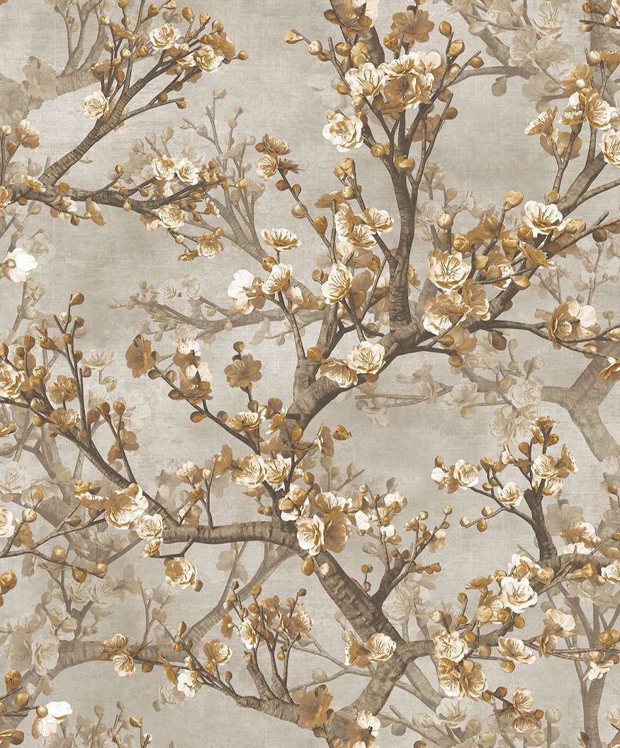 Elegáns dekor tapéta koptatott virágzó cseresznyefa mintával drapp és szürke színben, természeti és modern stílushoz