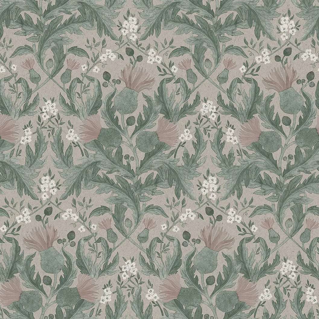 Elegáns mosható dekor tapéta bogáncs mintával zöld és szürke színben, skandináv és természeti stílushoz