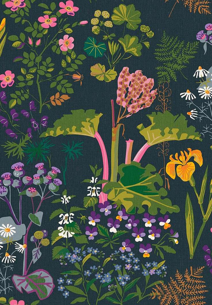 Elegáns mosható dekortapéta rebarbara mintával zöld háttéren vidám színben, skandináv és természeti stílushoz