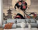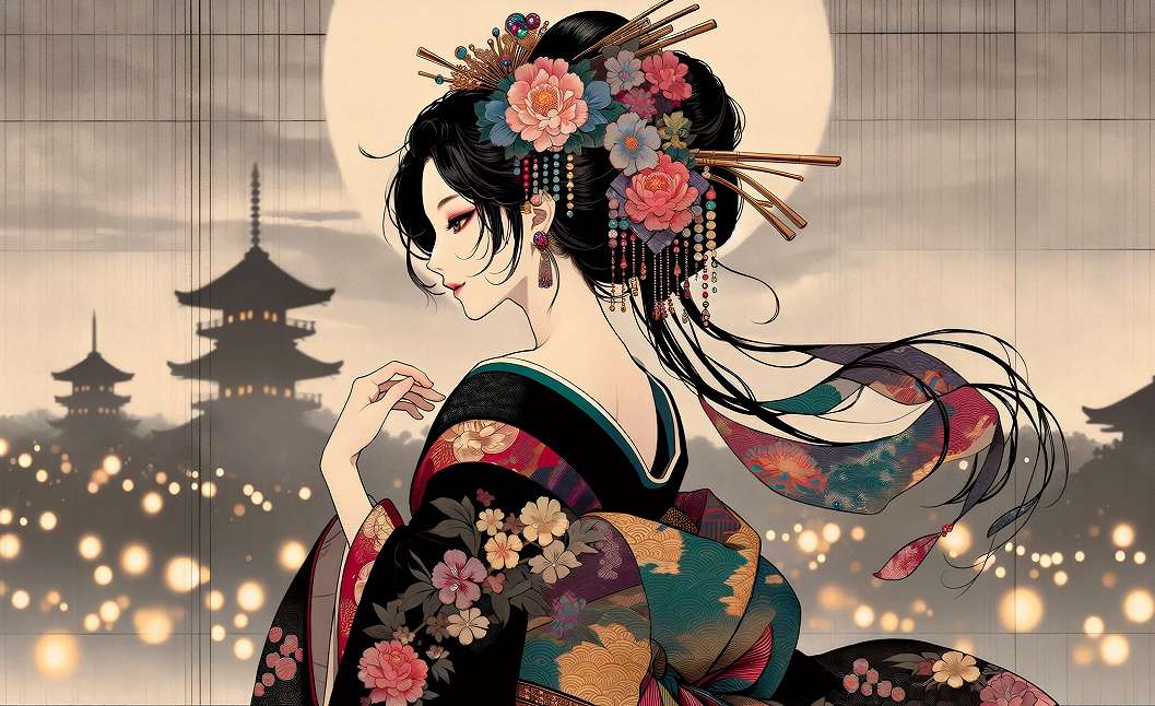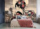 Japán női portré virágokkal a hajában vintage stílusbú fotótapéta