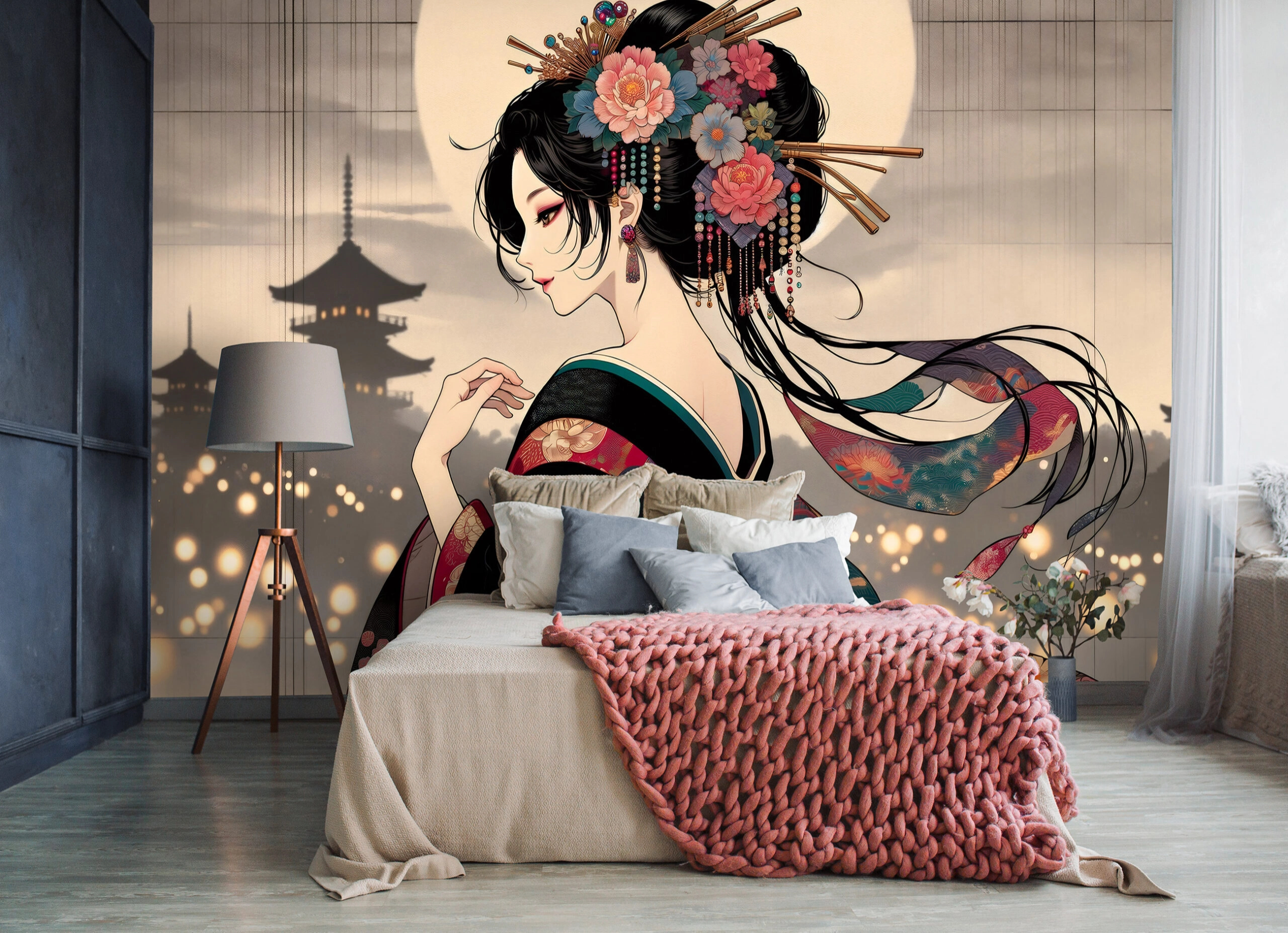 Fotótapéta japán női portré virágokkal a hajában vintage stílusban 368x254 vlies