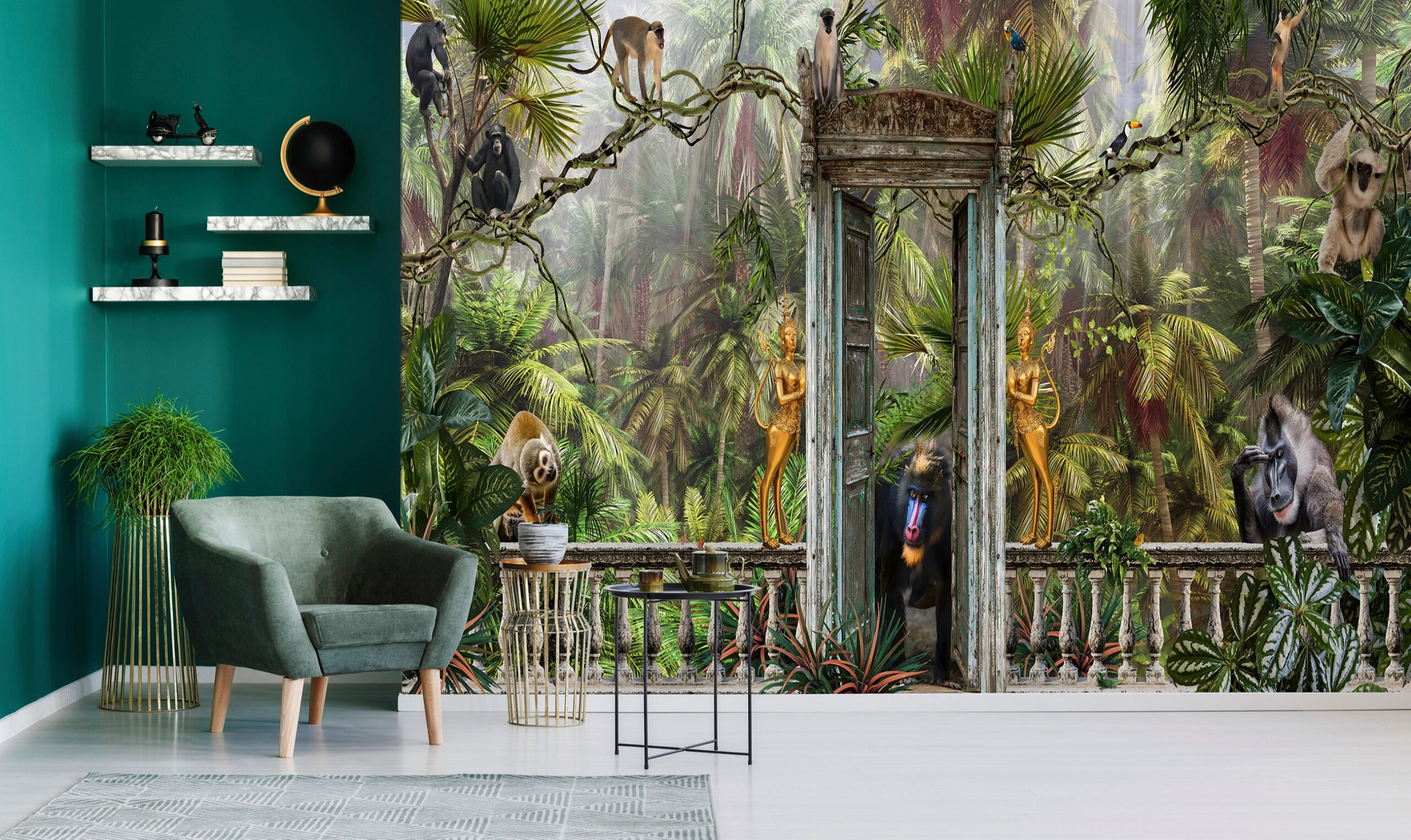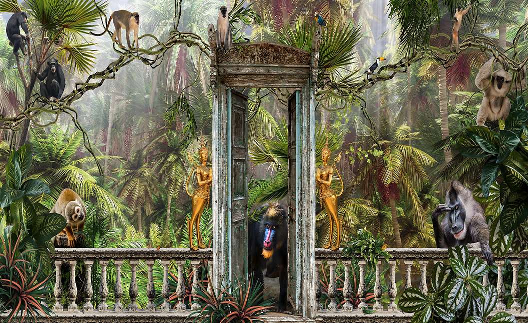 Fotótapéta kő korlát mögött dzsungel tájkép állatokkal 368x254 vlies