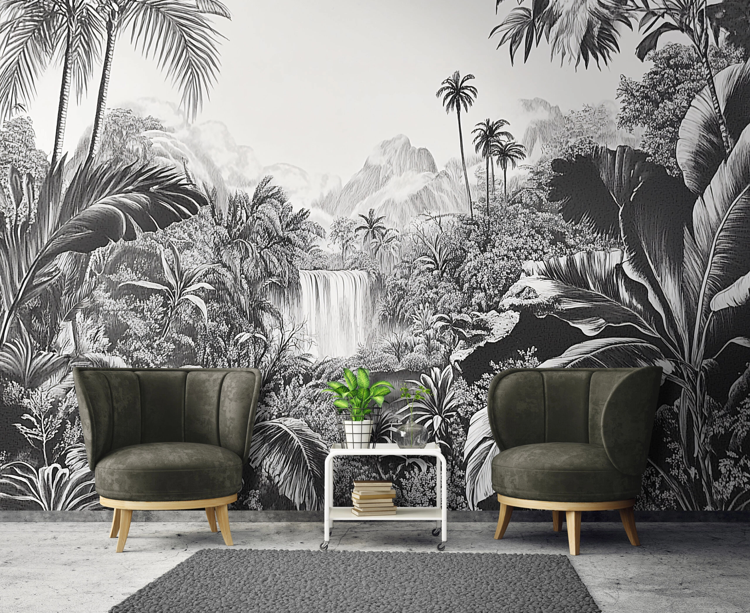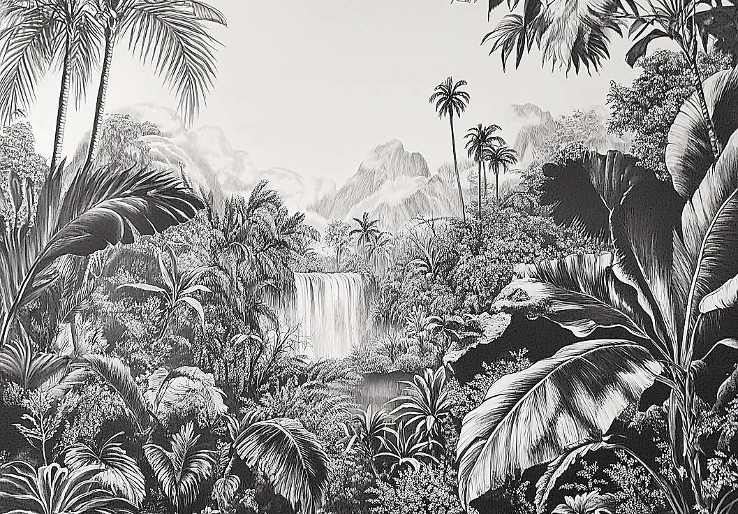 Fametszet hatású fotótapéta trópusi erdei tájkép vízeséssel