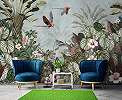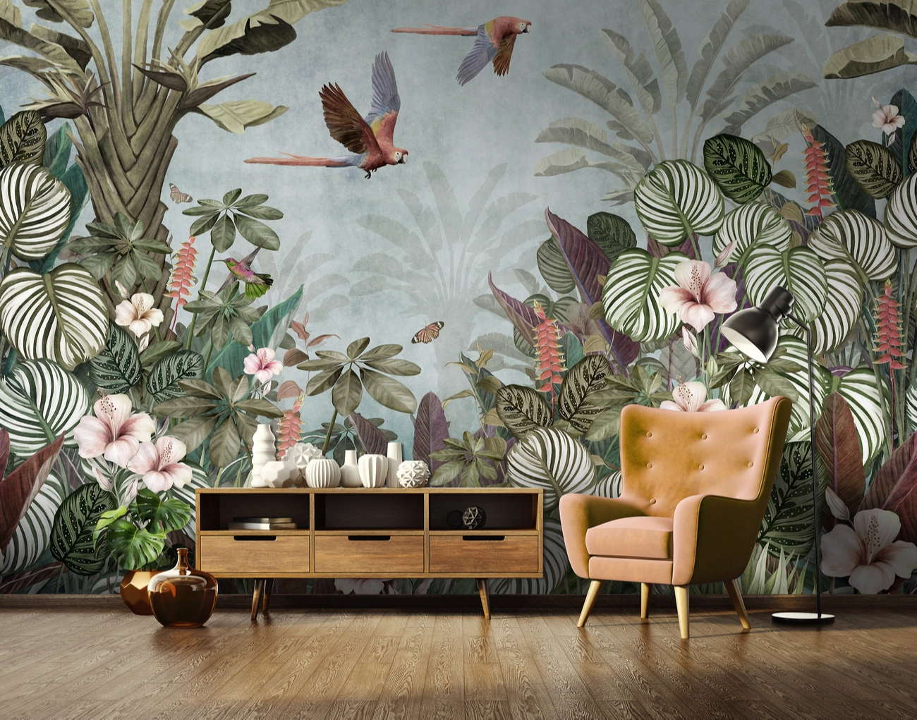 Fotótapéta vintage stílusú stilizált dzsungel növényekkel és papagájokkal