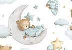 Gyerek dekor tapéta holdon pihenő mackó mintával szürke színben
