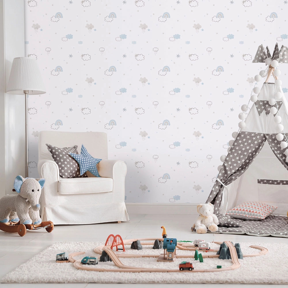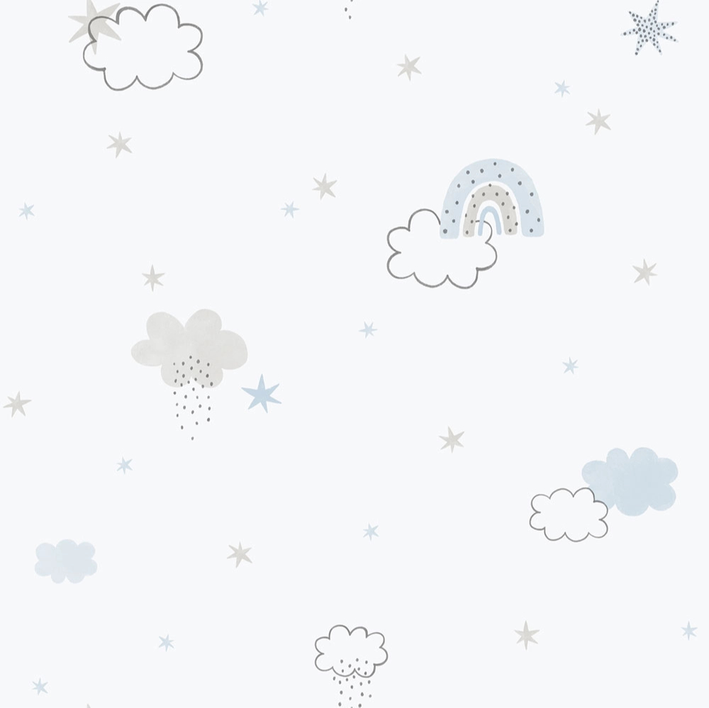 Gyerek dekor tapéta szürke és kék színben felhő, csillag és szivárvány mintával