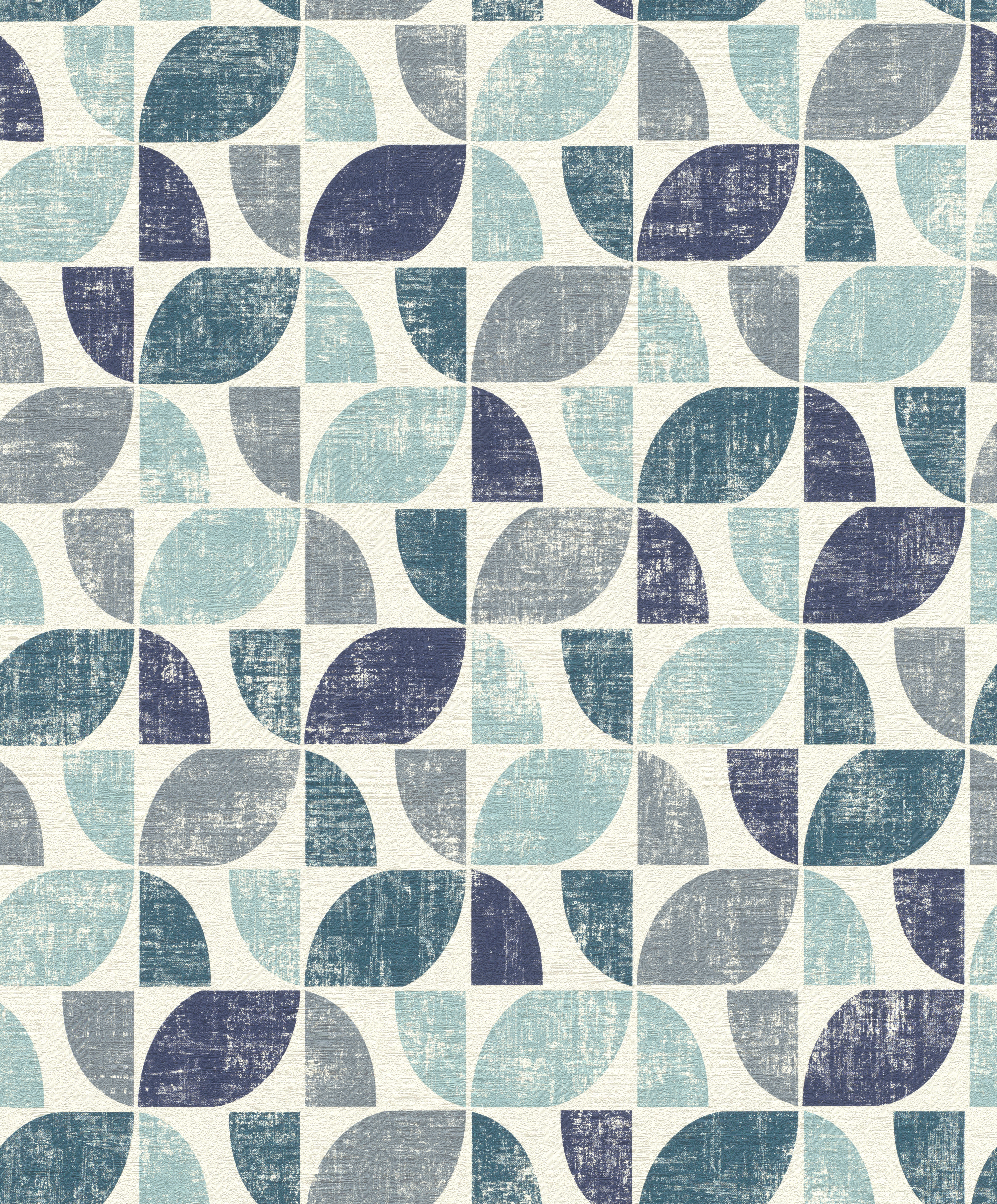 Kékes szürke-kék-türkiz retró mintás tapéta krémfehér alapon.