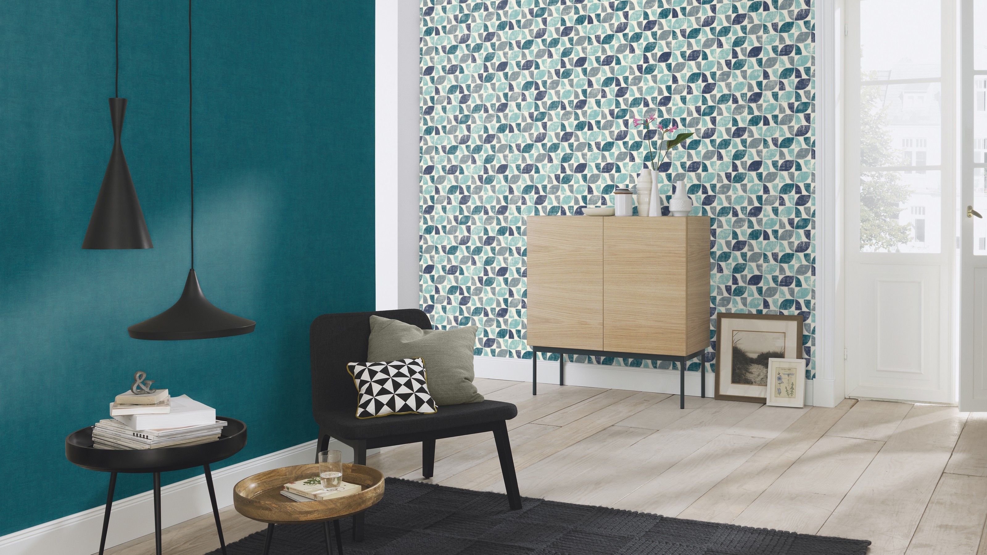 Kékes szürke-kék-türkiz retró mintás tapéta