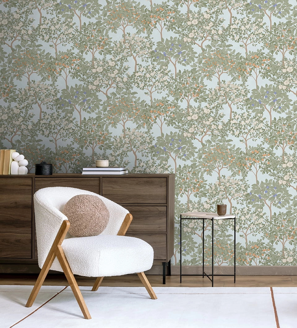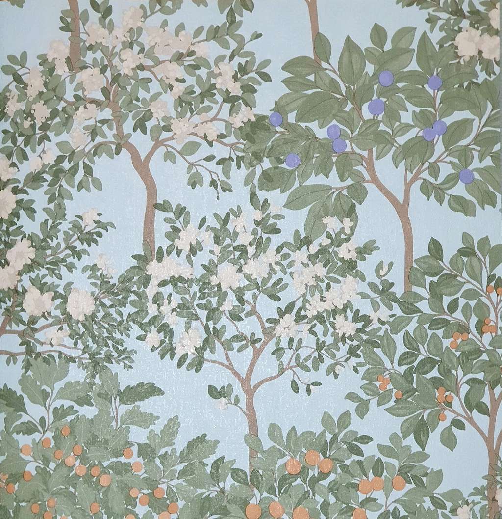 Mosható dekor tapéta égkék és zöld színű gyümölcsfa liget mintával