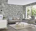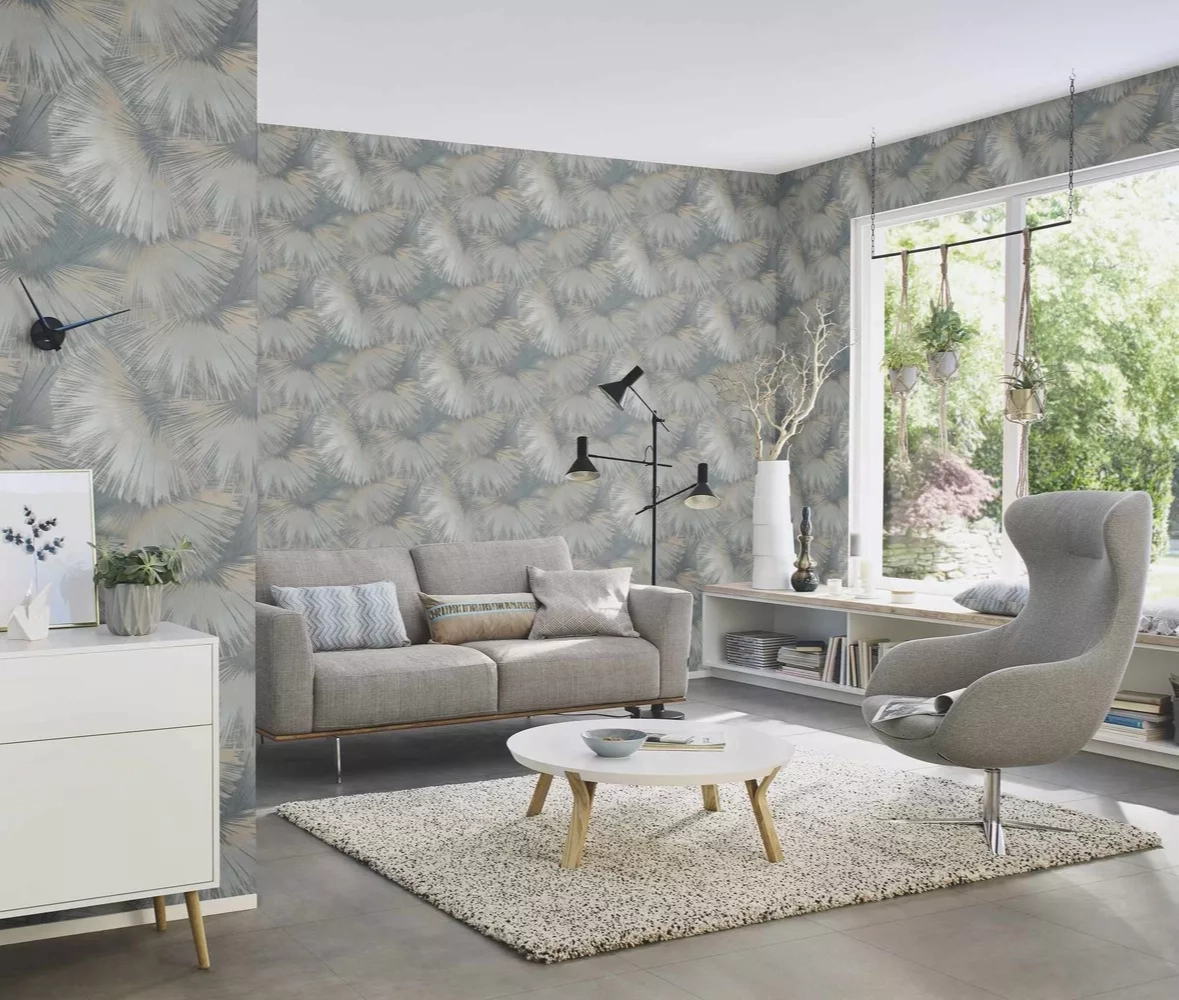 Mosható dekor tapéta kékesszürke, fényes ezüst és arany színben vonalas legyező mintával