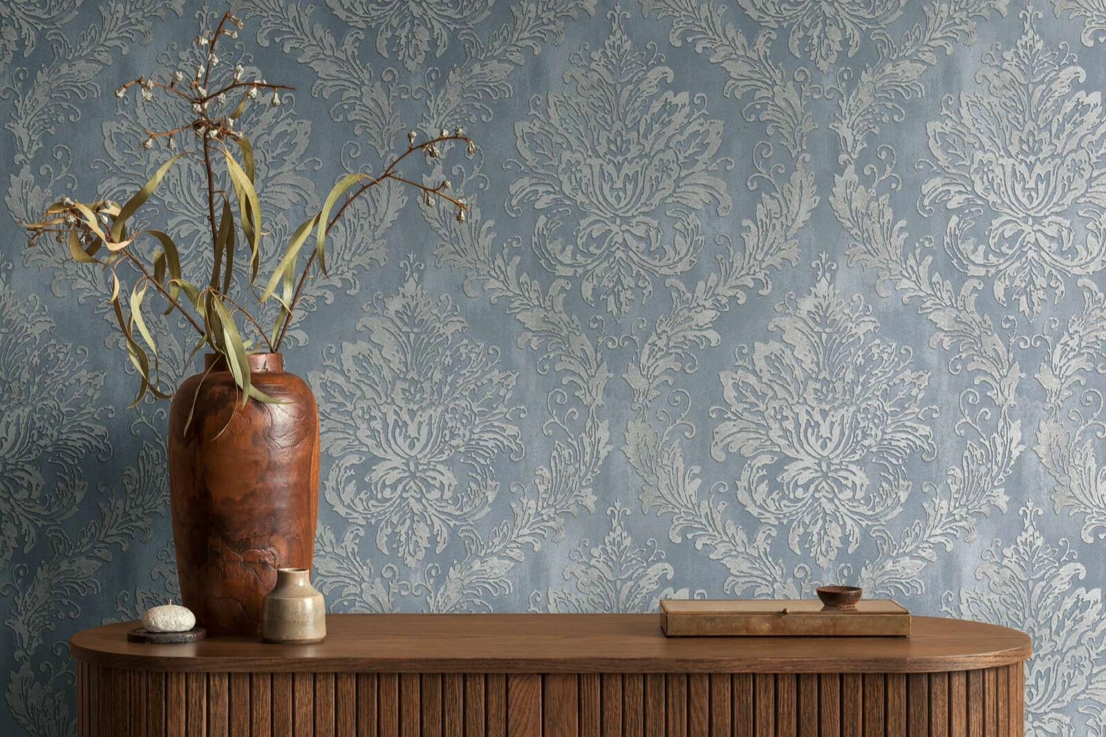 Mosható vinyl dekor tapéta bimbózó virág mintás fényes tengerkék színben