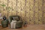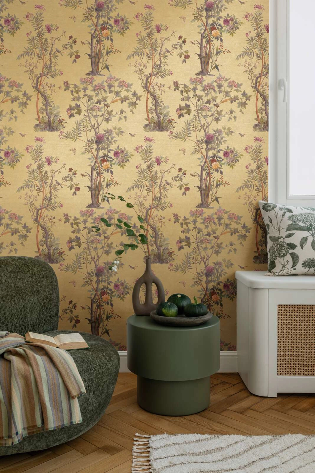 Mosható vinyl dekor tapéta virágzó leander madárkával és pillangókkal mintás arany színben