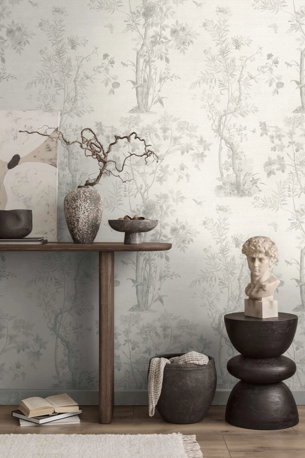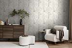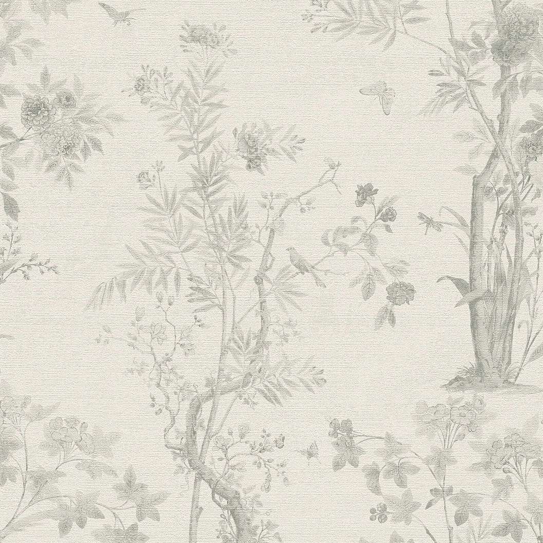 Mosható vinyl dekor tapéta virágzó leander madárkával és pillangókkal mintás ezüstös világosszürke színben