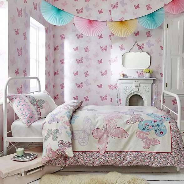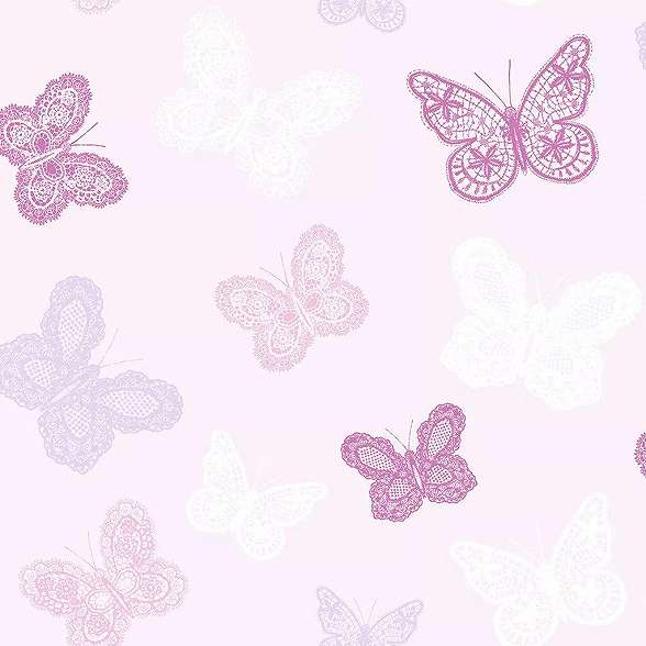 Rózsaszín alapon lila rózsaszín pillangó mintás tapéta lányszobába
