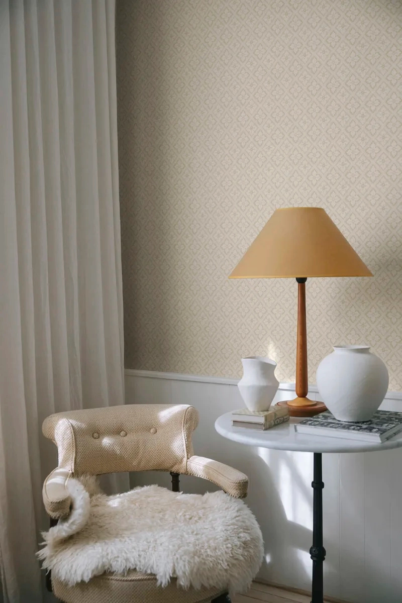 Skandináv dekor tapéta apróvirágos káró mintával homok színben Edvin, Sandstone, romantikus és vintage stílushoz