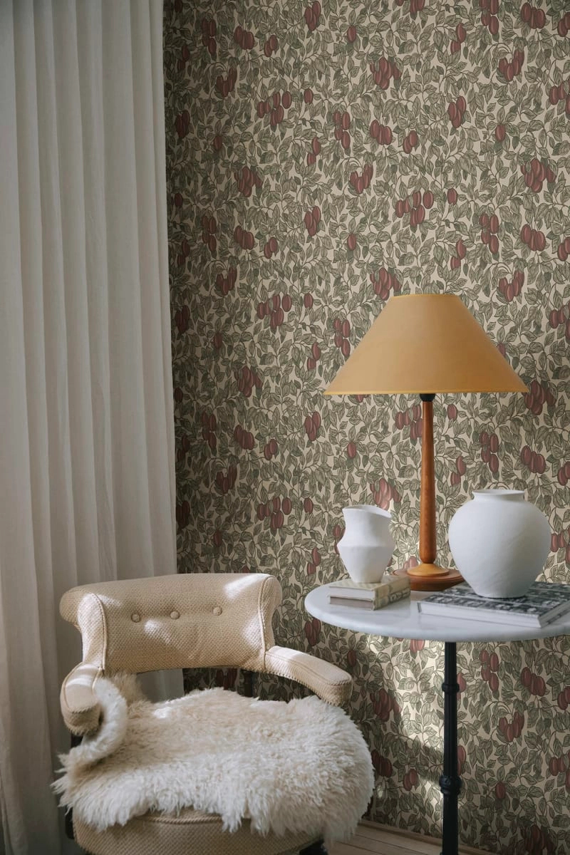 Skandináv dekor tapéta szilvafa mintával burgundy színben Emrik, Burgundy