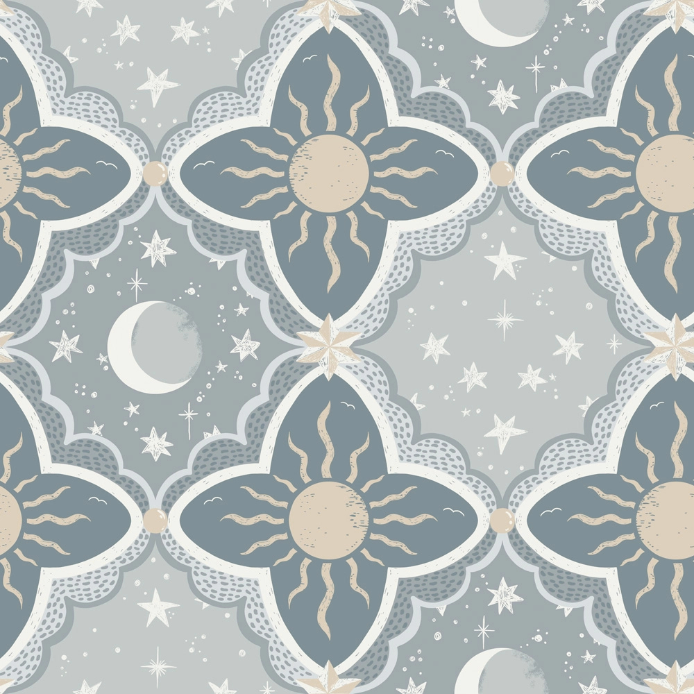 Skandináv gyerek tapéta kék színben égitestek mintával