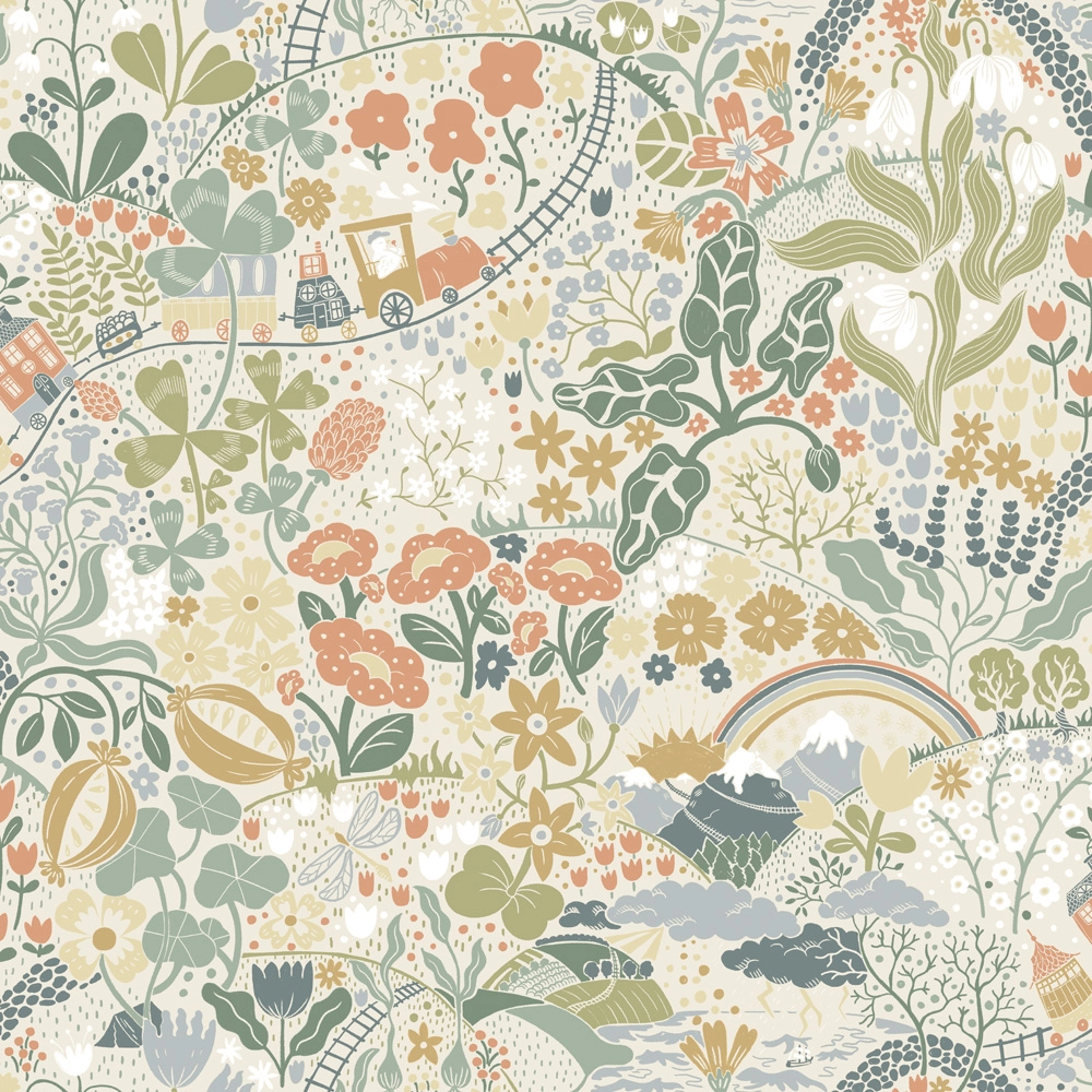 Skandináv gyerek tapéta zöld és narancssárga színben virágosrét és vonat mintával