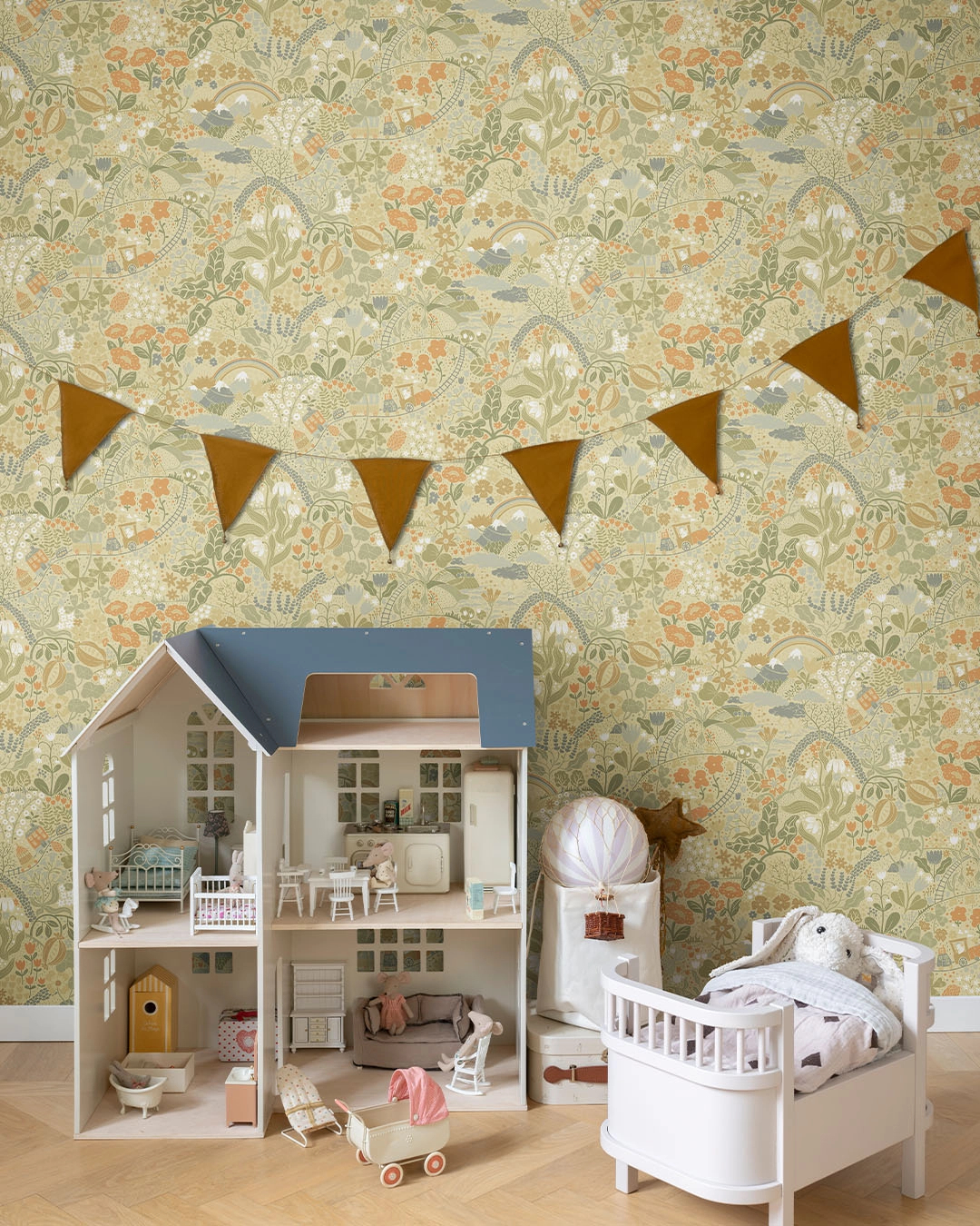 Skandináv gyerek tapéta zöld és sárga színben virágosrét és vonat mintával