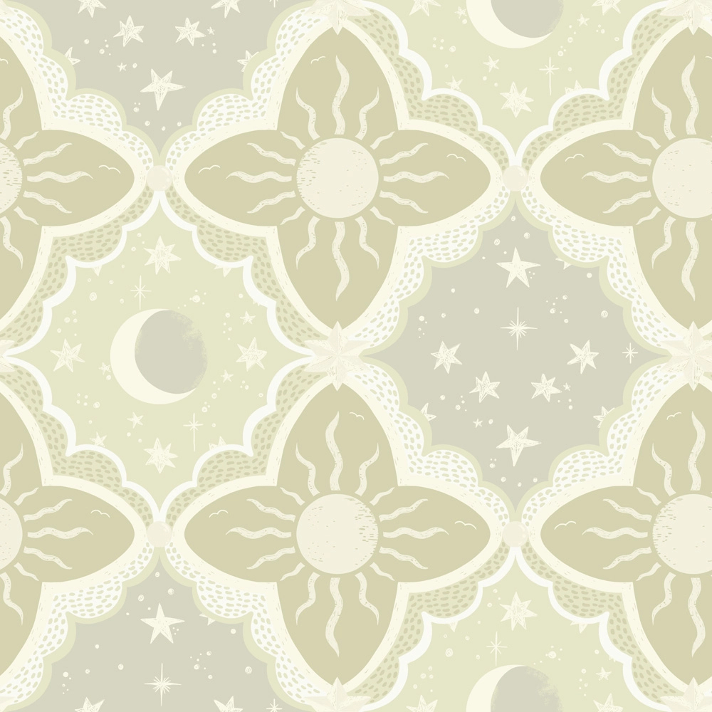 Skandináv gyerek tapéta zöld színben égitestek mintával