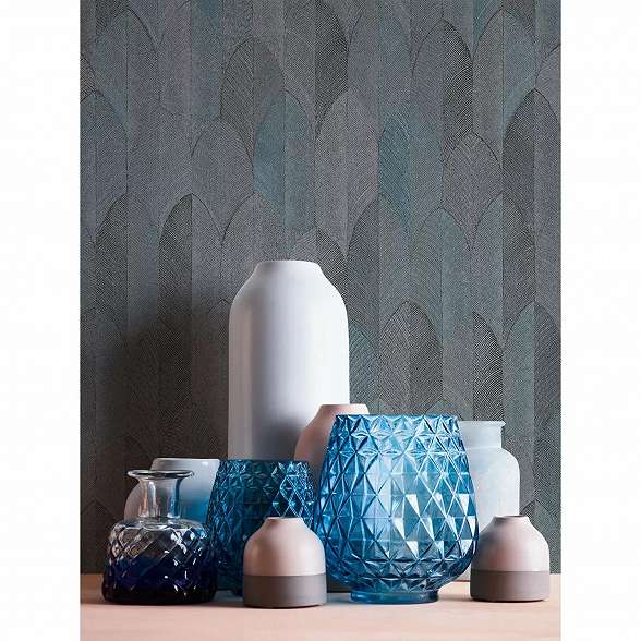 Szürke kék keleties hangulatú levélmintás vlies vinyl mosható felületű tapéta
