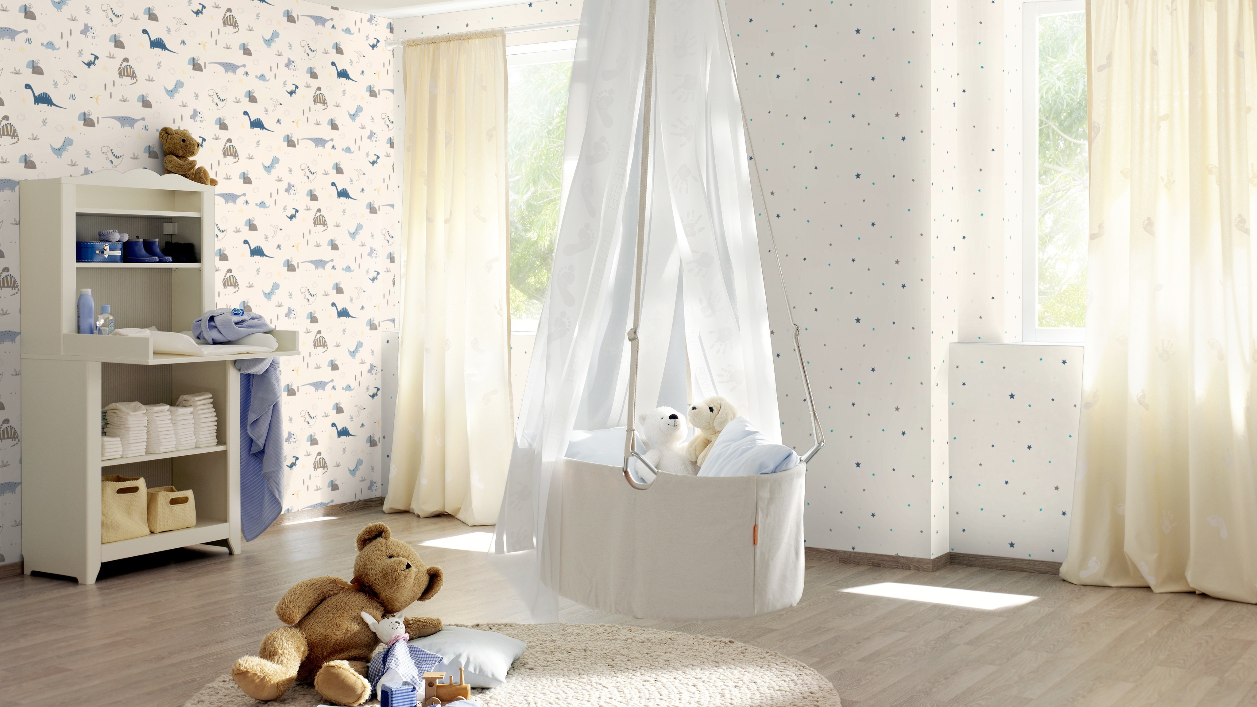 Vidám világos színű dinós gyerek tapéta.