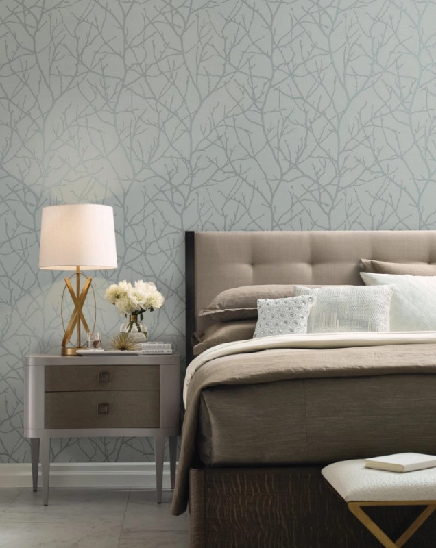 York, metál ezüs és szürke faág mintás vlies design tapéta