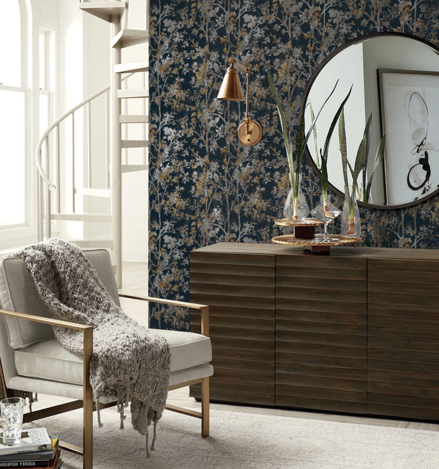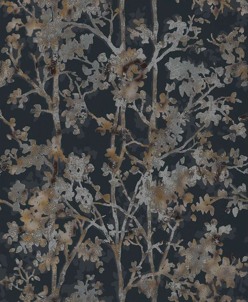 York tapéta fekete alapon metál arany és ezüst virágzó fa sziluett mintával