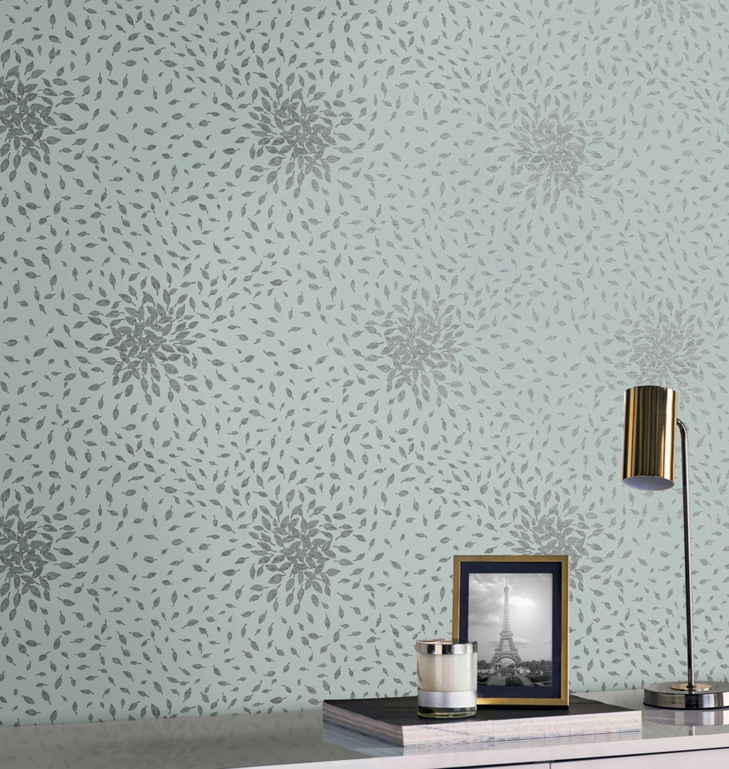 York tapéta kacsatojászürke alapon metál ezüst absztrakt levél mintával