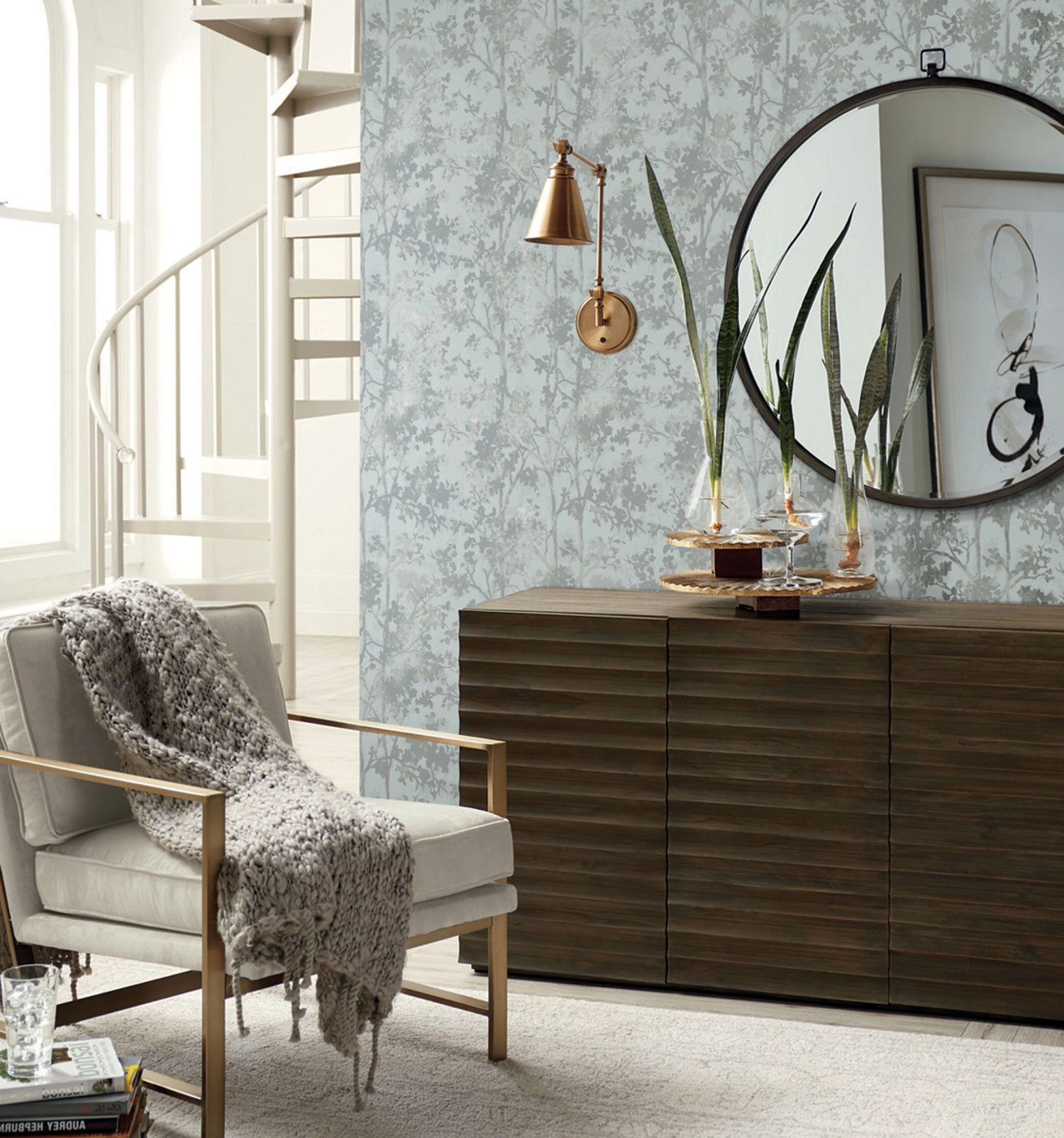 York tapéta kékesszürke alapon metál ezüst virágzó fa sziluett mintával