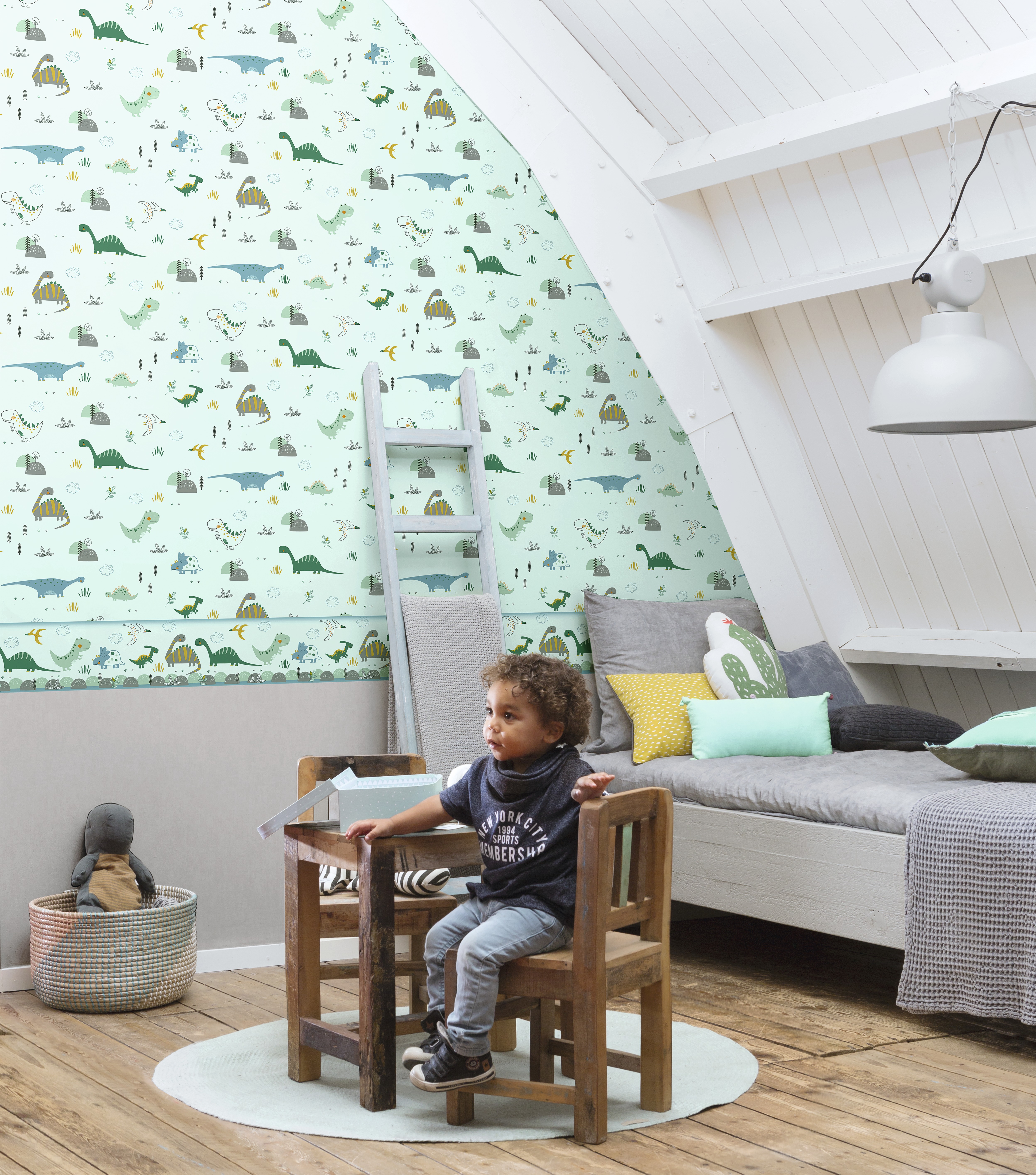 Zöld színű vidám dinós tapéta.